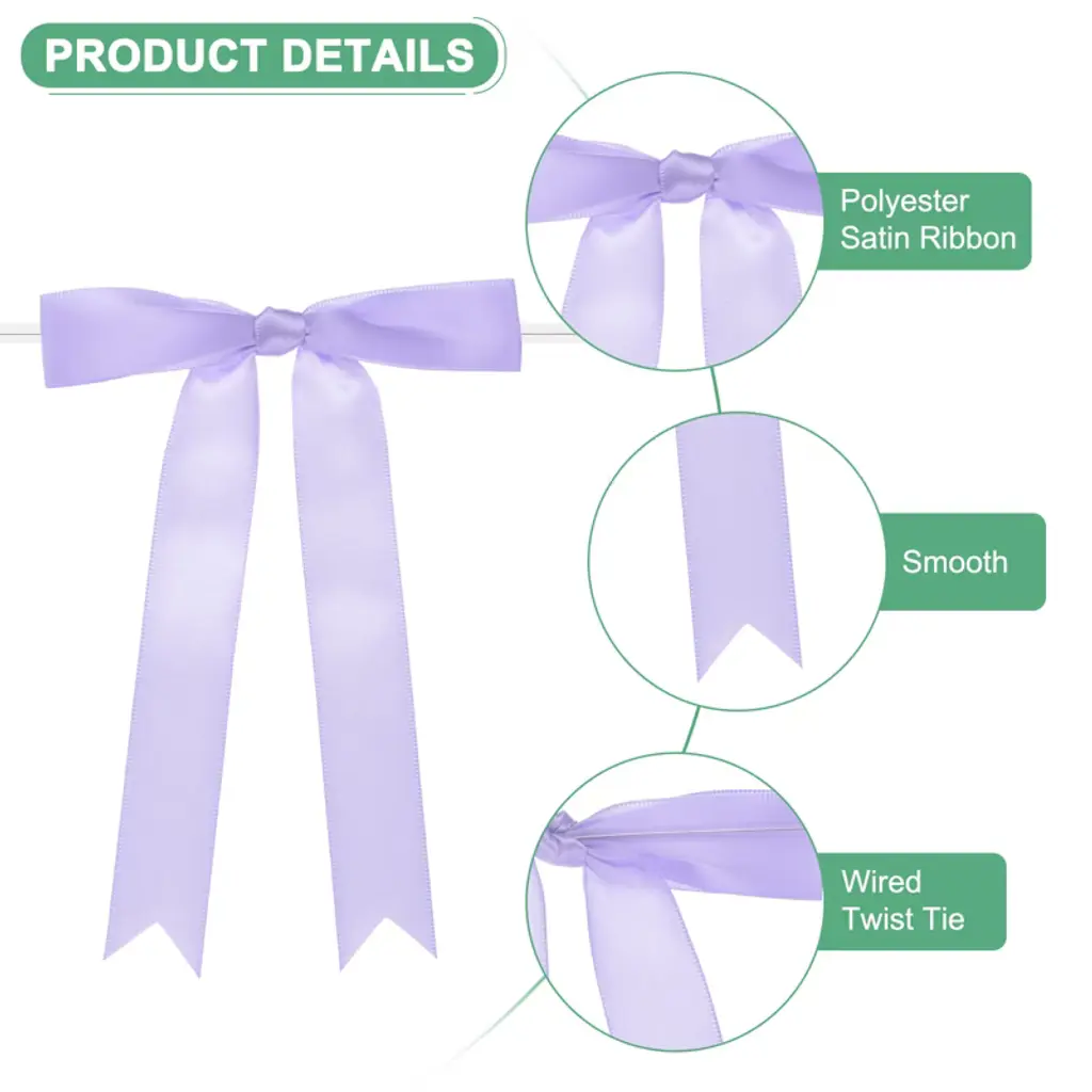 These satin ribbon bows with twist ties are versatile and perfect for various uses. Ideal for hemming and decorating handcrafts, gift bags, bakery candy bags, and present boxes, they can also be used for sleeping bags, tents, and clothing. Made from polyester, these bows offer a fine texture, are resistant to fading and wrinkles, and are flexible to the touch. Their classic and fashionable design makes them suitable for hair accessories, Christmas gifts, baking decorations, gift box packaging, hotel decorations, wedding decorations, flower packaging, and birthday arrangements. Choose a color that matches your project or gift wrapping paper, and secure the bows with twist ties or glue to desired surfaces like gift boxes, cards, or crafts. Adjust the position as needed to achieve the perfect look.