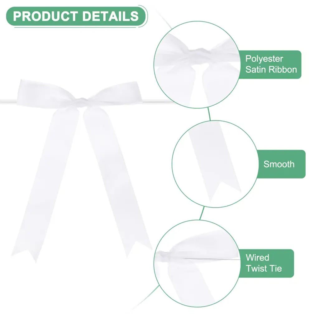 These satin ribbon bows with twist ties are versatile and perfect for various uses. Ideal for hemming and decorating handcrafts, gift bags, bakery candy bags, and present boxes, they can also be used for sleeping bags, tents, and clothing. Made from polyester, these bows offer a fine texture, are resistant to fading and wrinkles, and are flexible to the touch. Their classic and fashionable design makes them suitable for hair accessories, Christmas gifts, baking decorations, gift box packaging, hotel decorations, wedding decorations, flower packaging, and birthday arrangements. Choose a color that matches your project or gift wrapping paper, and secure the bows with twist ties or glue to desired surfaces like gift boxes, cards, or crafts. Adjust the position as needed to achieve the perfect look.