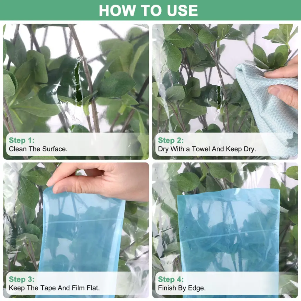 The greenhouse plastic repair tape is designed for versatile use, making it ideal for repairing vegetable greenhouses, flower films, and damaged plastic bags. It can also be used to fix rips in tarpaulins, tents, and raincoats, eliminating the need for purchasing new greenhouse films. This tape boasts strong toughness, allowing it to stretch significantly while maintaining durable adhesion. It is waterproof and efficient for repairs, and can be easily cut for convenient application. Notably, it leaves no trace after removal. The tape is capable of withstanding high temperatures up to 95 degrees and low temperatures down to -45 degrees, making it suitable for harsh outdoor conditions. For installation, ensure the cracked area is clean and dry, apply the tape slowly, and press it firmly. For larger cracks, apply the tape on both sides.