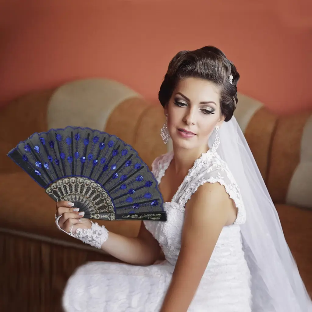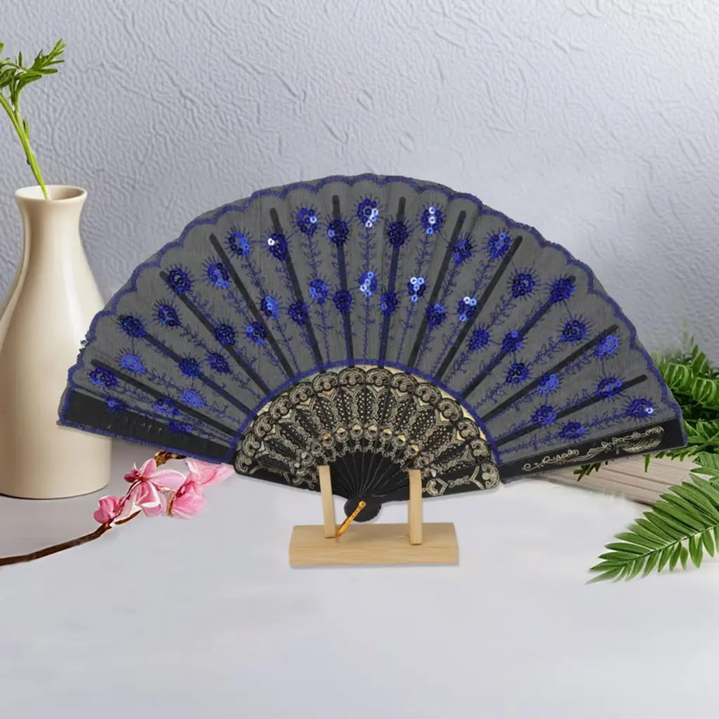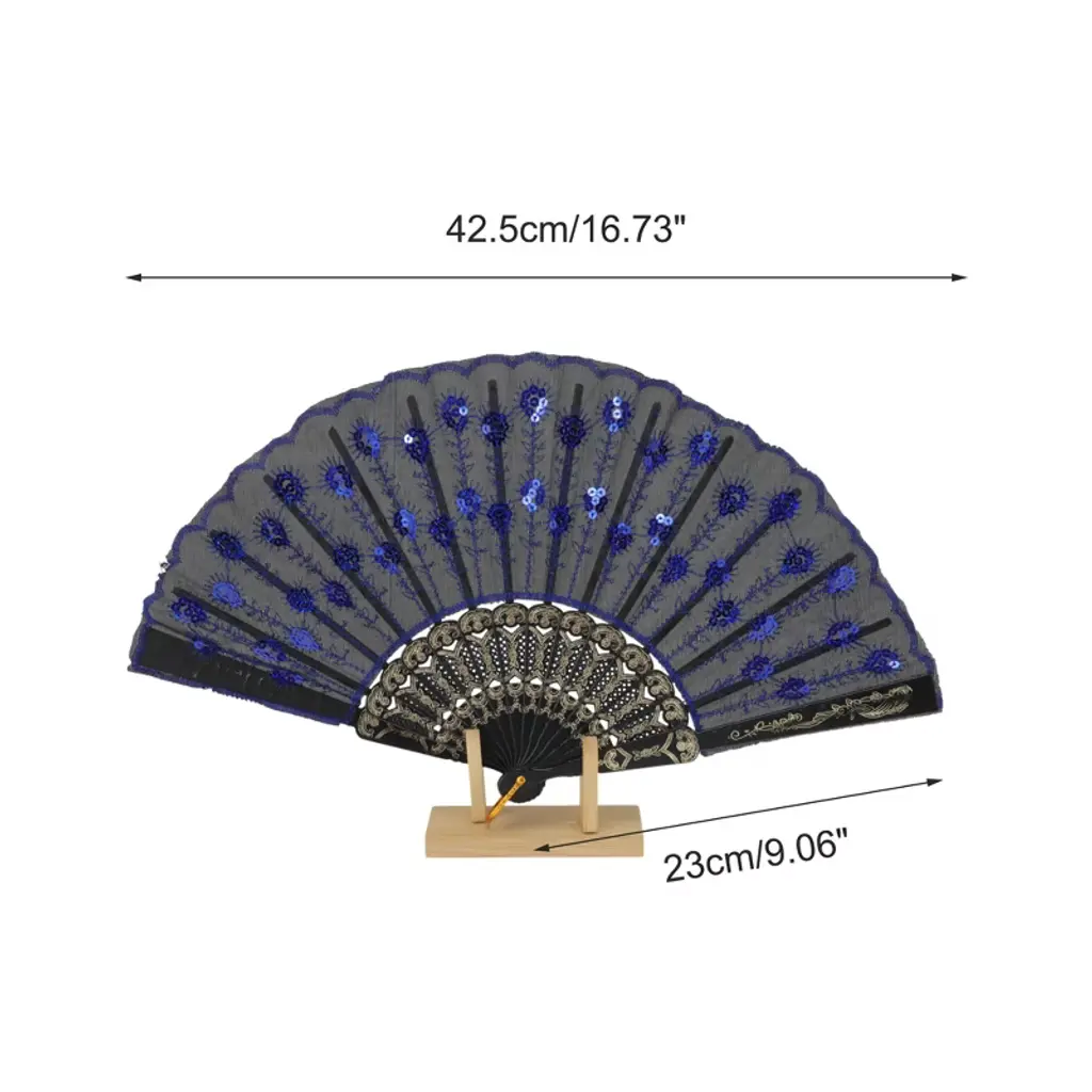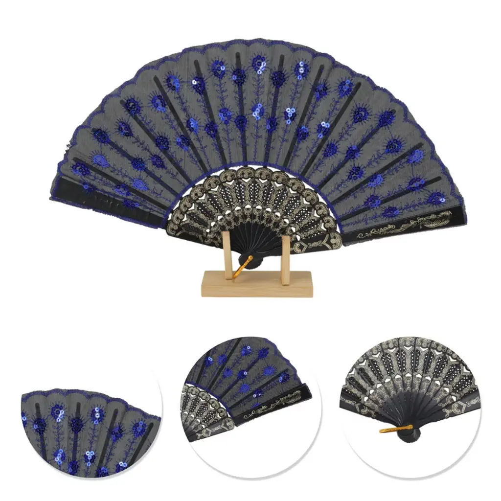Unique Bargains Sequins Folding Fan Dark Blue 1 Pc