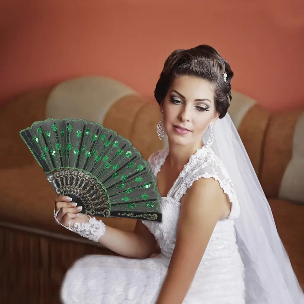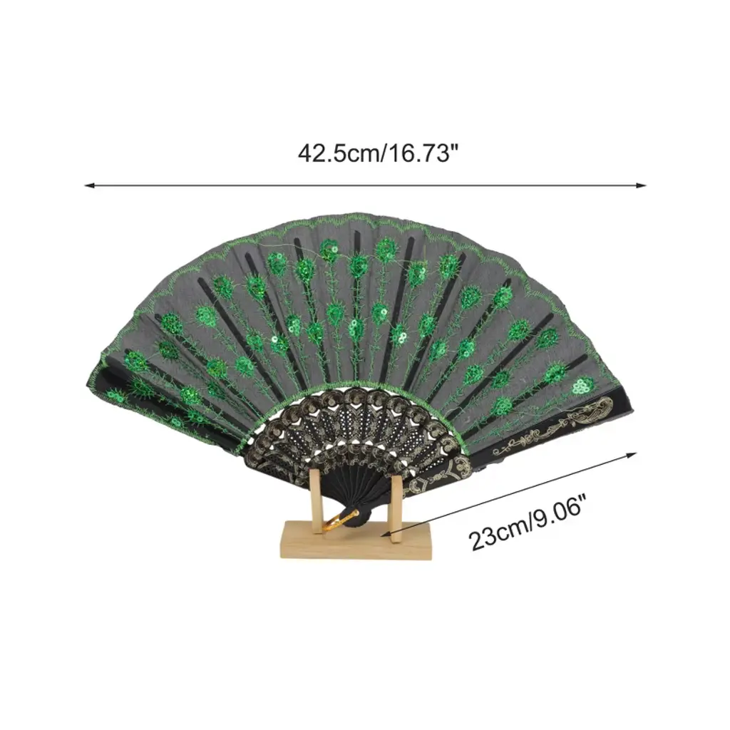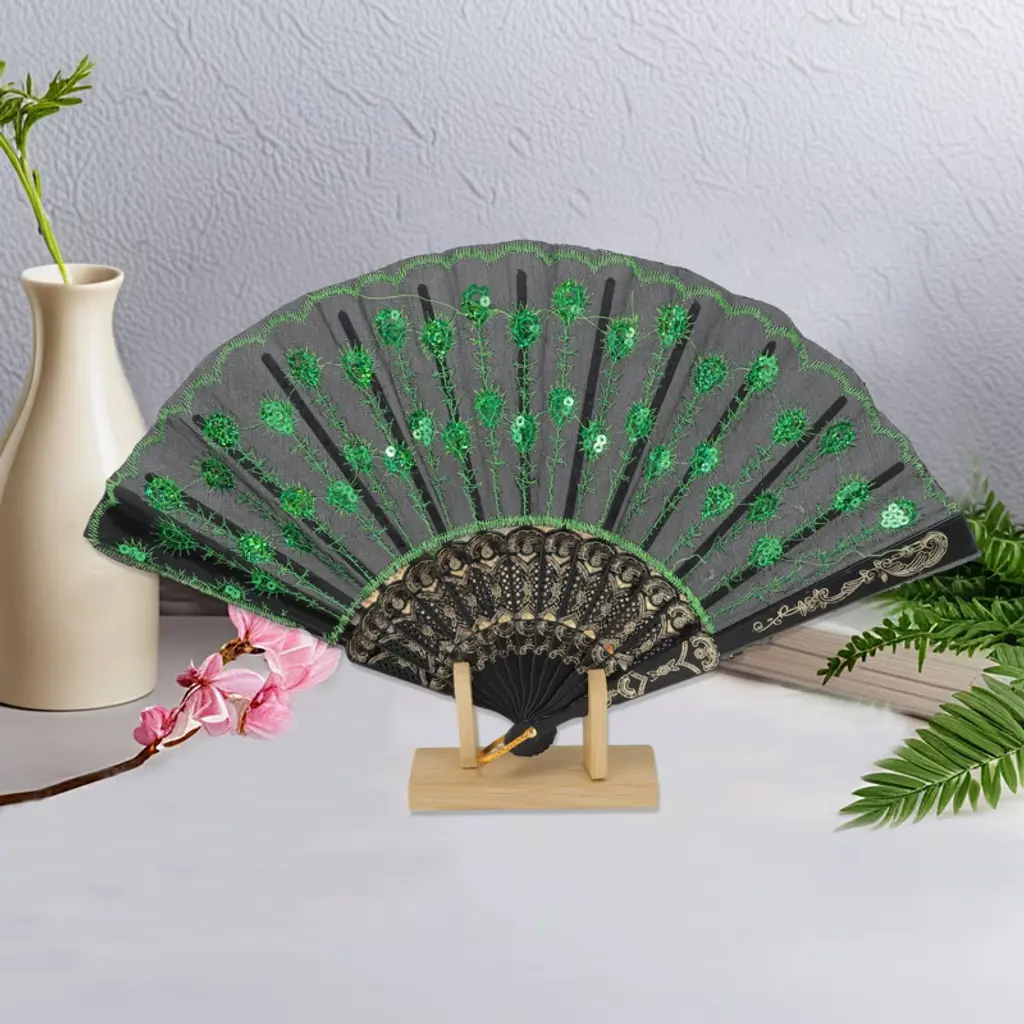 Unique Bargains Sequins Folding Fan Green 1 Pc