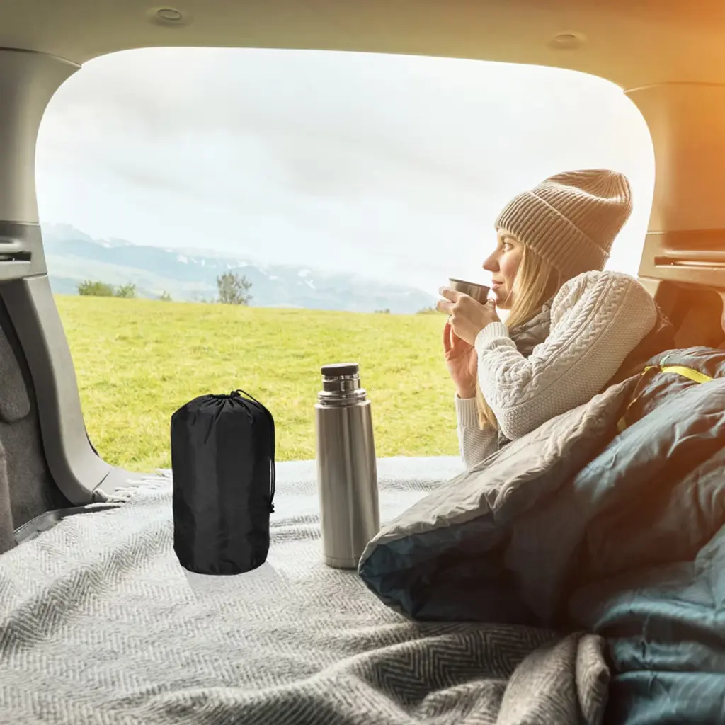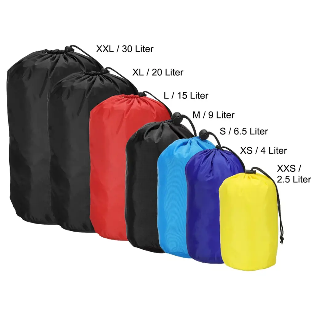 This stuff sack is perfect for organizing and transporting various items such as clothes, blankets, sleeping bags, pillows, hats, gloves, books, and electronic devices. It is an excellent choice for outdoor activities like camping, hiking, cycling, backpacking, traveling, and trekking. Crafted from nylon, it is waterproof, lightweight, and portable, ensuring durability and resistance to wear. The drawstring closure allows for easy access and adjustment, while the round bottom design adds stability and enhances its large capacity. This compact storage solution helps keep belongings tidy and organized, making it a practical addition to any outdoor gear.