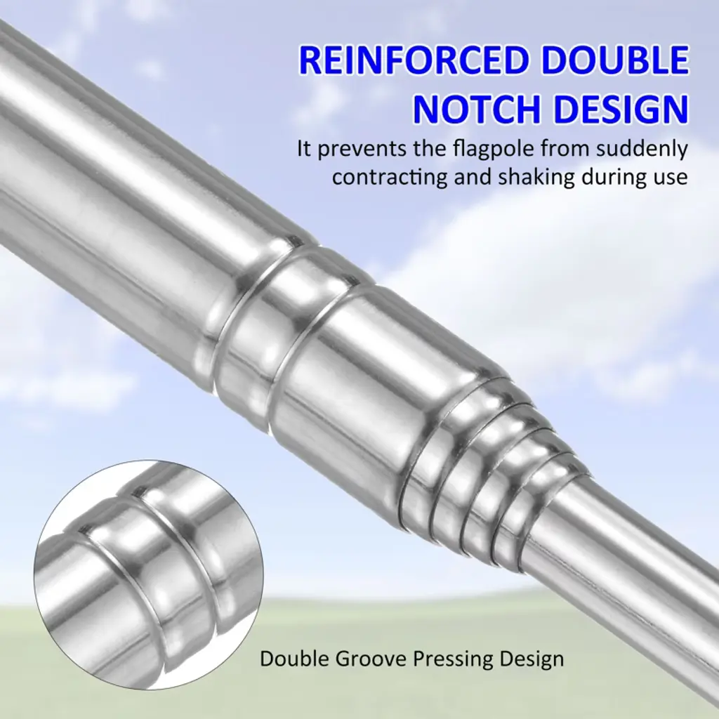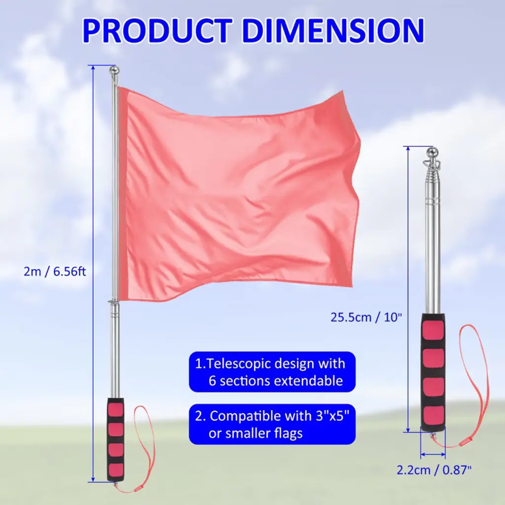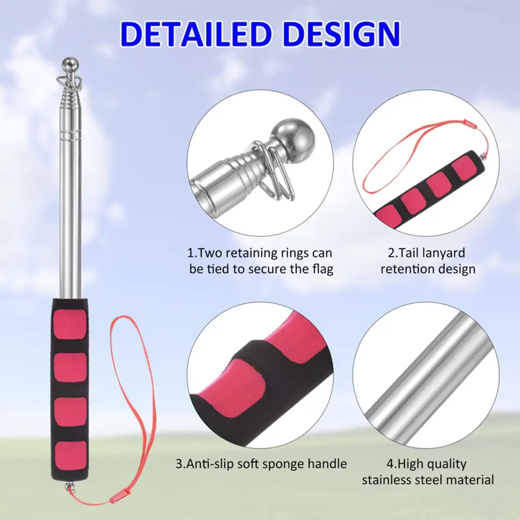 The retractable flagpole is versatile, connecting national flags and banners, and serving as a pointer for teachers. It's ideal for tourism, travel, outdoor activities, training, and more. The reinforced double notch design ensures the flagpole can be telescoped and secured to any desired size, with a retainer strap for flag security. The high-density foam handle offers a stylish, comfortable, non-slip grip. Lightweight and portable, it's easy to store and carry. Made of quality stainless steel, the flag pole is glossy, rust, and corrosion-resistant, ensuring durability. Confirm the size and color before ordering.