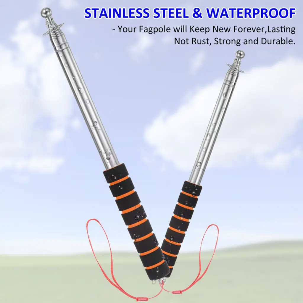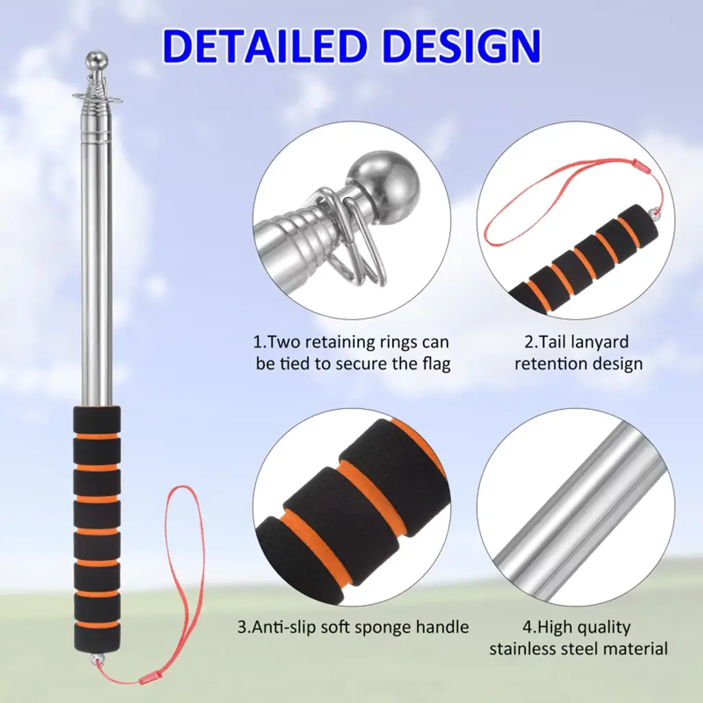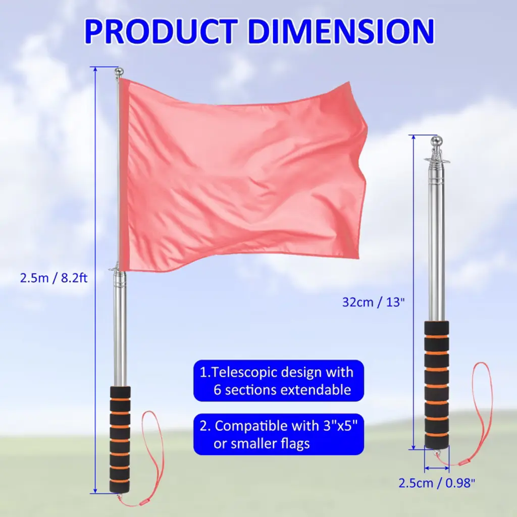 The retractable flagpole is versatile, connecting national flags and banners, and also serves as a pointer for teachers. It's ideal for tourism, travel, outdoor activities, training, and more. The reinforced double notch design ensures the flagpole can be adjusted to any size, and it includes two retainer straps for securing flags. The high-density foam handle provides a stylish, comfortable, non-slip grip. The flagpole is lightweight, easy to store, and carry. It is made of quality stainless steel with a polished, rust-resistant surface, making it sturdy and durable. The package includes a telescopic handheld flagpole, measuring 2.5m/8.2ft in length. Please confirm the size and color before ordering.