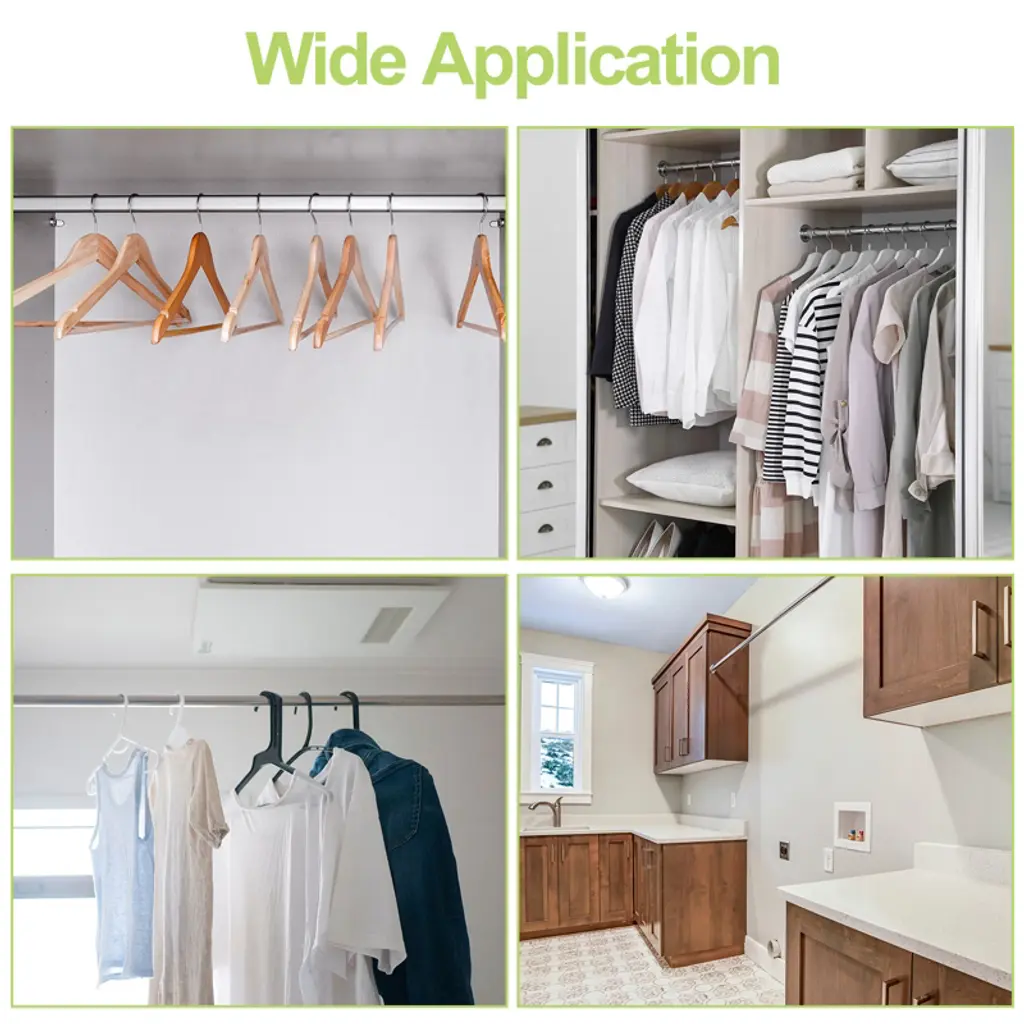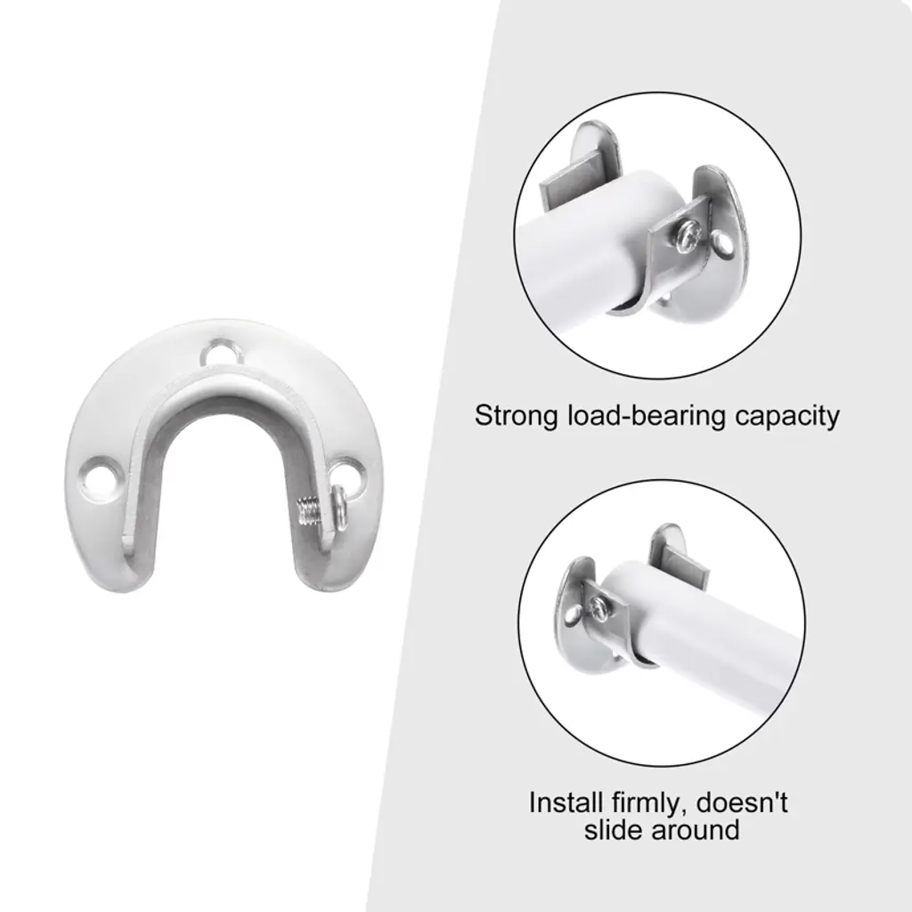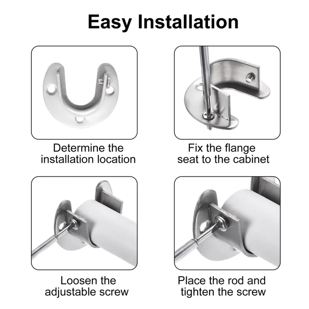 These stainless steel closet rod brackets are designed to provide reliable support for your wardrobe or curtain rods. Constructed from 204 stainless steel, they offer excellent hardness, load-bearing capacity, and corrosion resistance, ensuring long-lasting durability and a rust-proof finish. The U-shaped design allows for easy installation and quick removal of rods, accommodating a maximum diameter of 19mm (3/4 inch). These brackets are versatile and can be used with various types of pipes, such as stainless steel, solid wood, aluminum alloy, and PVC. Equipped with adjustable screws, they are easy to install by simply securing the screws in the bracket's base holes. This ensures stability and prevents the rod from shaking or rotating. Ideal for use in closet storage, wardrobes, balcony drying areas, bathroom curtains, kitchen storage, and other storage spaces, these brackets offer a practical and economical solution for organizing your space.