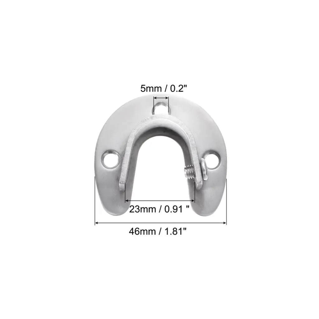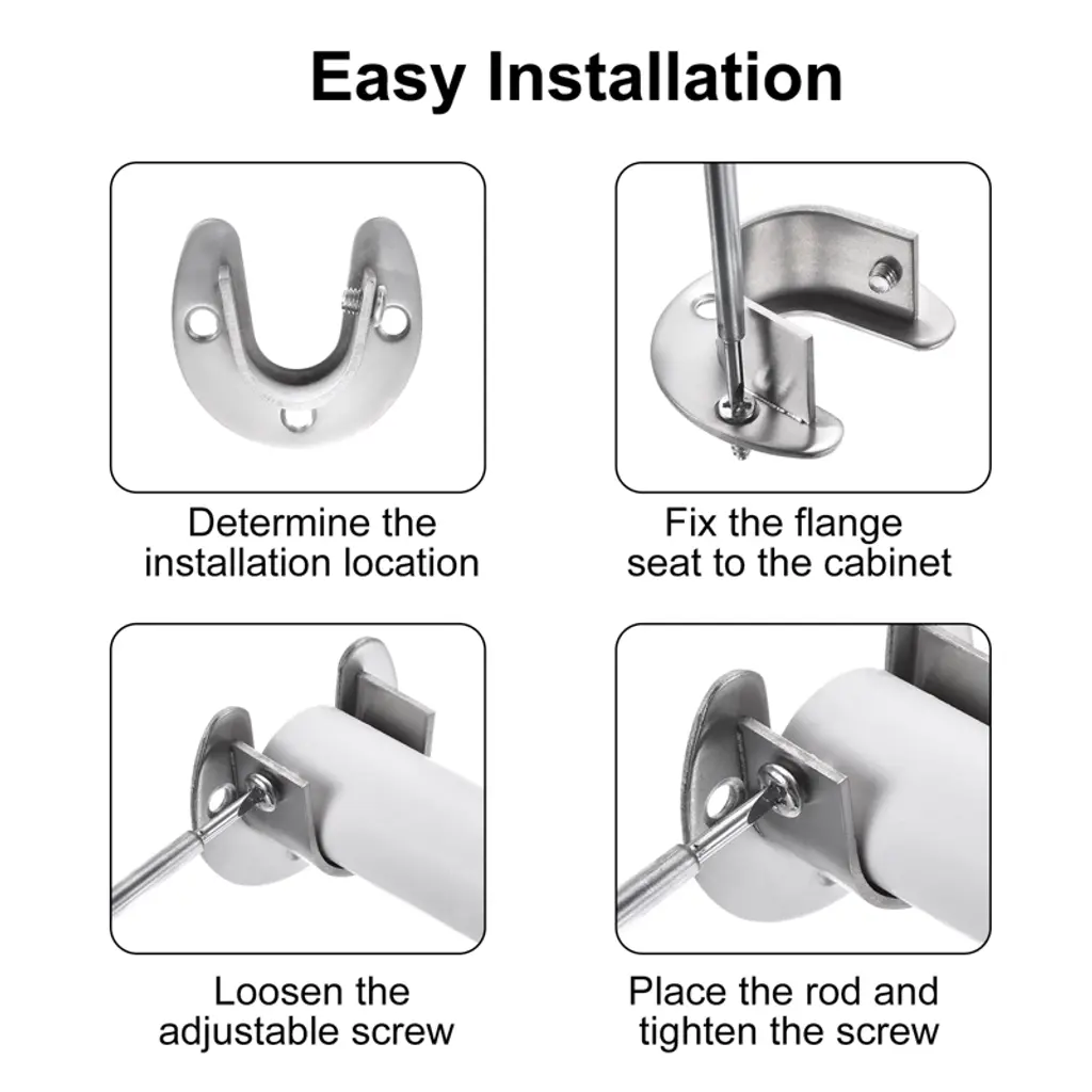 These stainless steel closet rod brackets are designed to provide reliable support for your wardrobe or curtain rods. Constructed from 204 stainless steel, they offer excellent hardness, load-bearing capacity, and corrosion resistance, ensuring long-lasting durability and a rust-proof finish. The U-shaped design allows for easy installation and quick removal of rods, accommodating a maximum diameter of 19mm (3/4 inch). These brackets are versatile and can be used with various types of pipes, such as stainless steel, solid wood, aluminum alloy, and PVC. Equipped with adjustable screws, they are easy to install by simply securing the screws in the bracket's base holes. This ensures stability and prevents the rod from shaking or rotating. Ideal for use in closet storage, wardrobes, balcony drying areas, bathroom curtains, kitchen storage, and other storage spaces, these brackets offer a practical and economical solution for organizing your space.