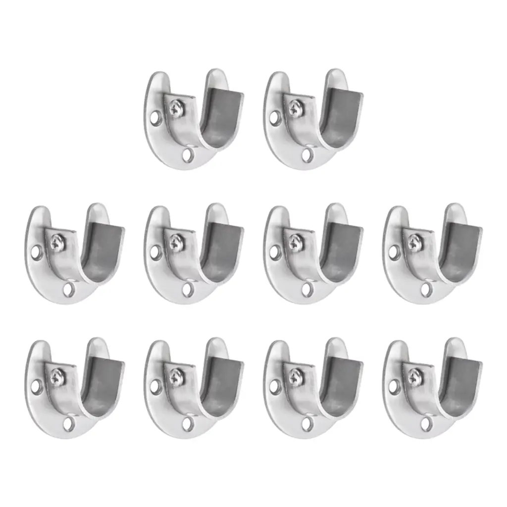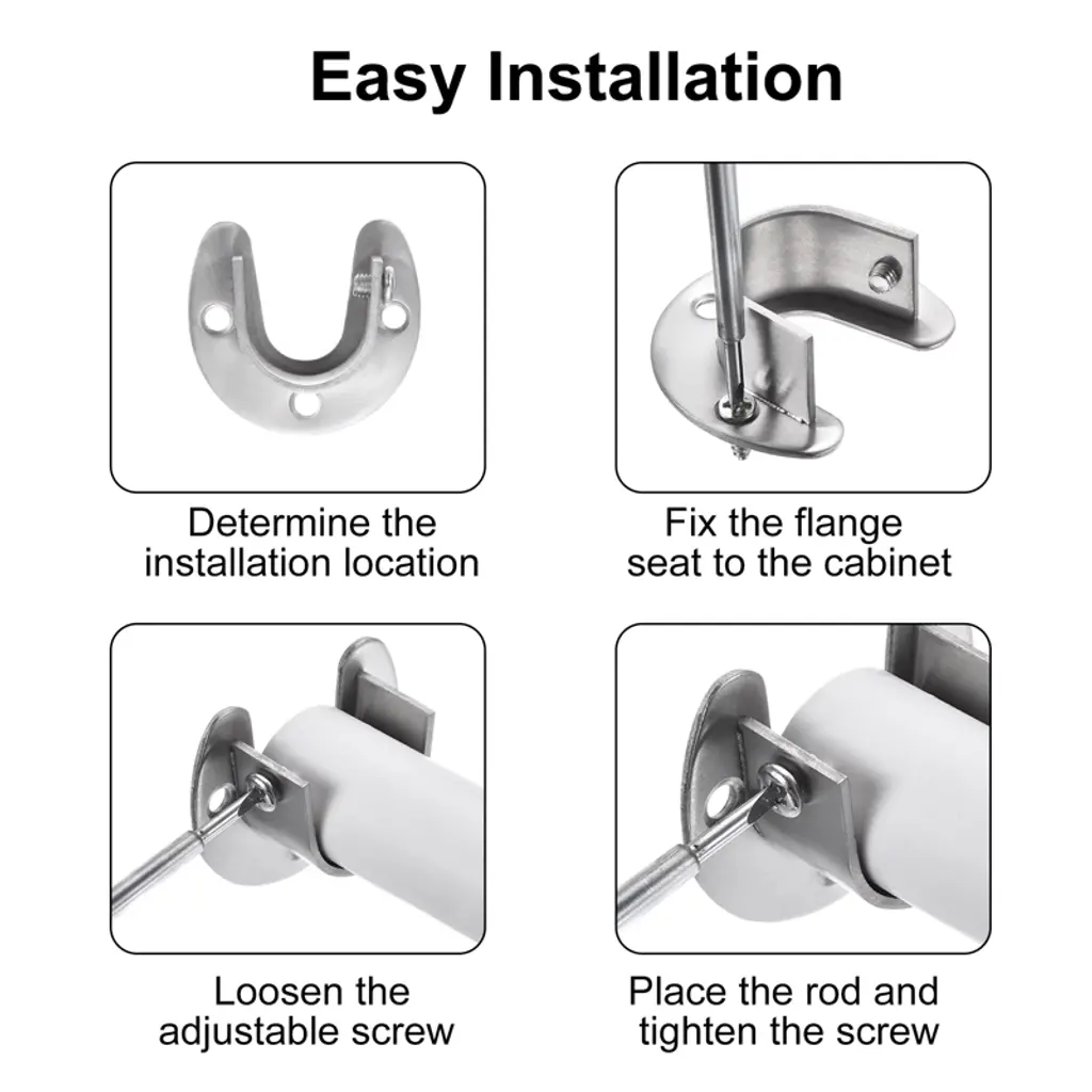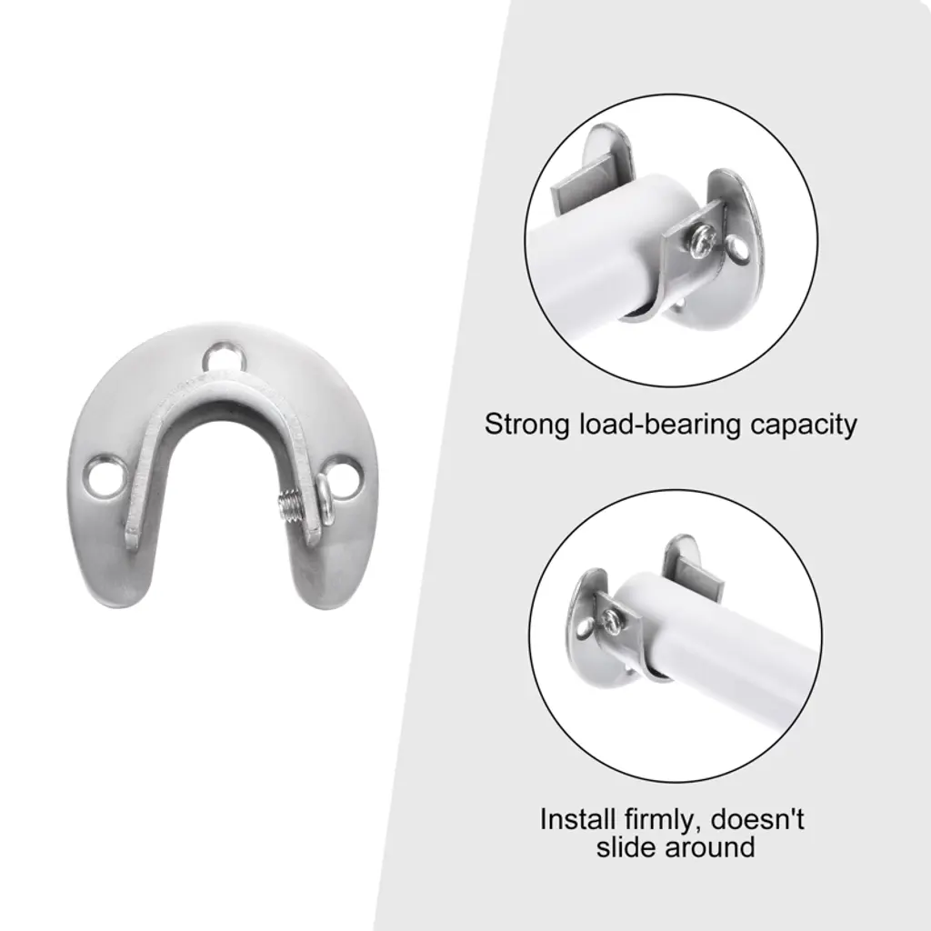 These stainless steel closet rod brackets are designed to provide reliable support for your wardrobe or curtain rods. Constructed from 204 stainless steel, they offer excellent hardness, load-bearing capacity, and corrosion resistance, ensuring long-lasting durability and a rust-proof finish. The U-shaped design allows for easy installation and quick removal of rods, accommodating a maximum diameter of 19mm (3/4 inch). These brackets are versatile and can be used with various types of pipes, such as stainless steel, solid wood, aluminum alloy, and PVC. Equipped with adjustable screws, they are easy to install by simply securing the screws in the bracket's base holes. This ensures stability and prevents the rod from shaking or rotating. Ideal for use in closet storage, wardrobes, balcony drying areas, bathroom curtains, kitchen storage, and other storage spaces, these brackets offer a practical and economical solution for organizing your space.