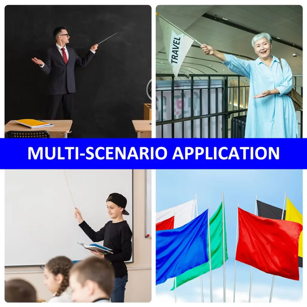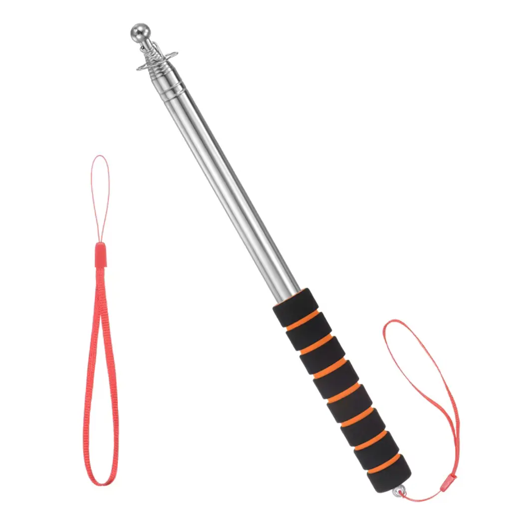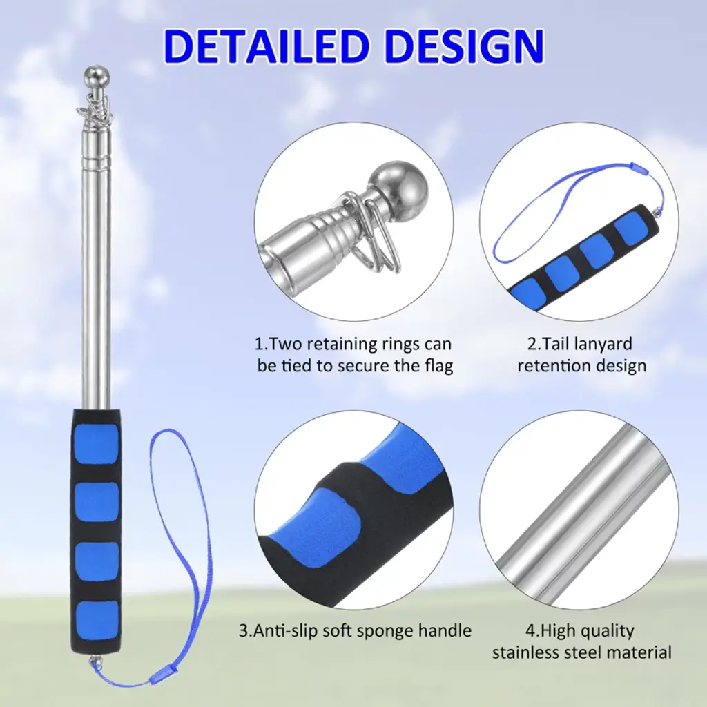 The retractable flagpole is a versatile tool for connecting national flags and banners, as well as serving as a pointer for teachers. It's perfect for tourism, travel, outdoor activities, and more. The reinforced double notch design ensures the flagpole can be telescoped and secured at any size, and it includes a retainer strap for flag security. The handle is made of density foam for a stylish, comfortable, non-slip grip. Lightweight and easy to store, it is made of quality stainless steel with a polished, rust-resistant surface. Confirm the size and color of the tour guide flag pole before ordering.