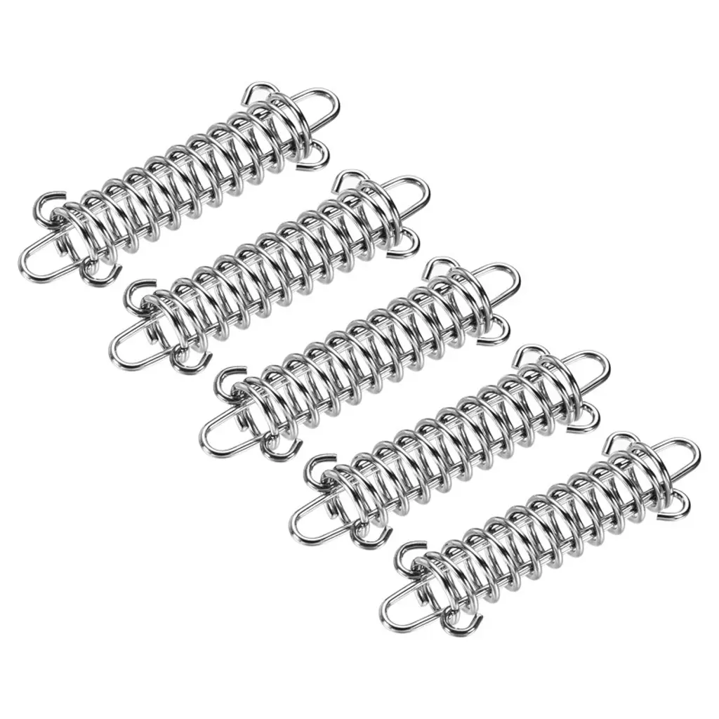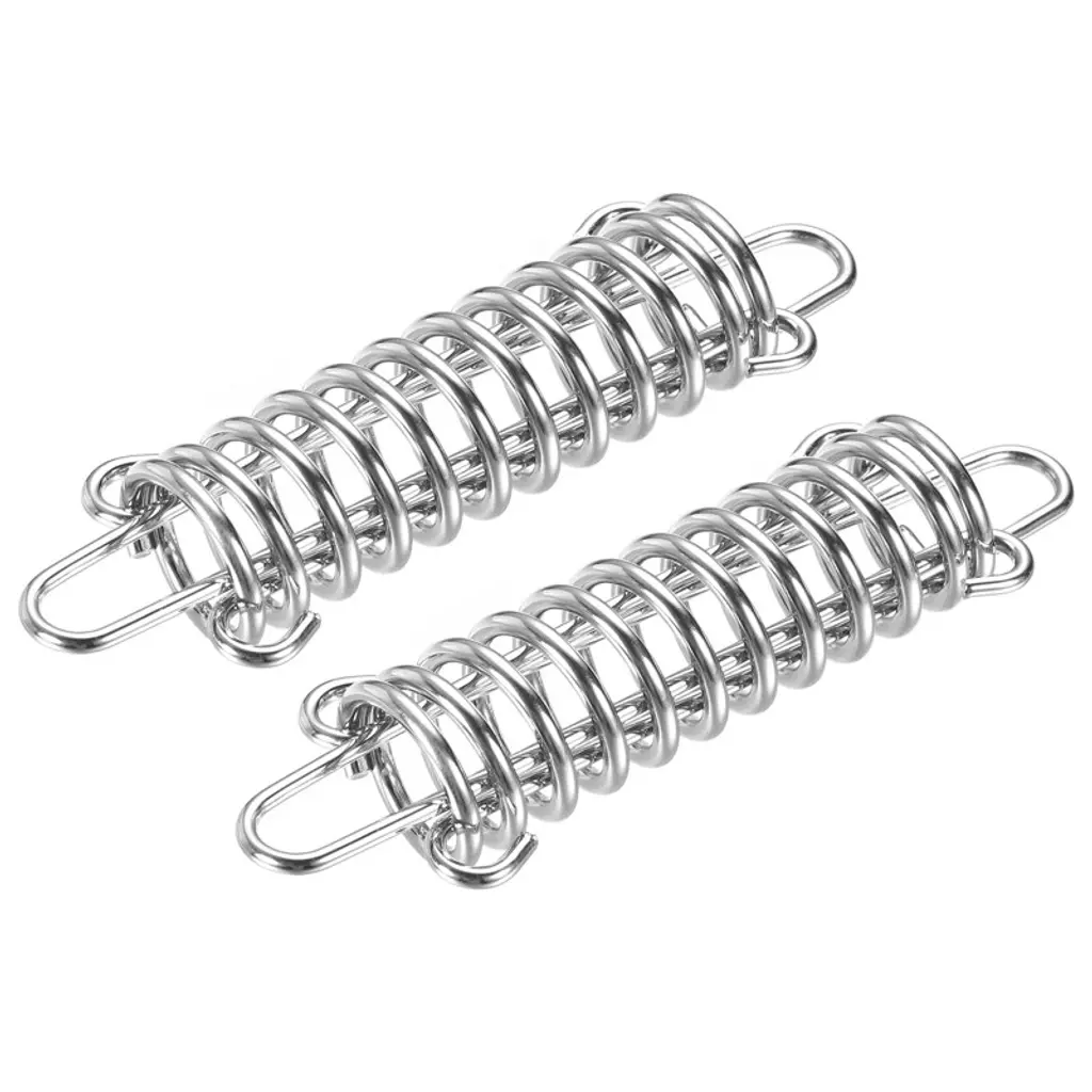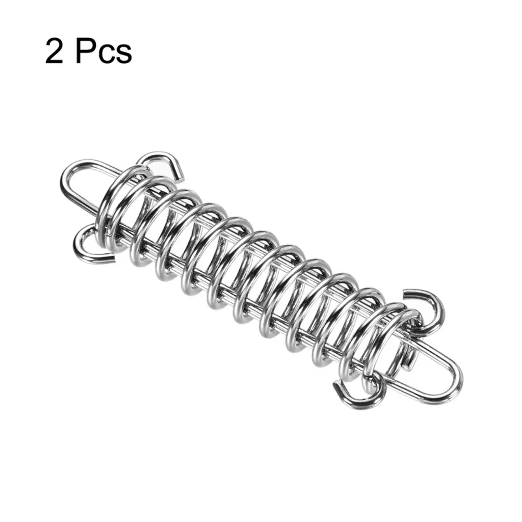 What is this? The tent spring buckle provides protection for the tent, canopy, awning, rain tarp and more. when the strong wind comes, the spring hook can cushion the wind and prevent tents from being damaged by wind. Widely used for outdoor, camping, hiking, boating, fishing, backpacking, etc. What to get? Color: Silver Tone; Material: Stainless Steel; Overall Size: 90mmx30mm / 3.5"x1.2" (L*W); Are there any advantages of the product? Made of stainless steel, anti-rust, and corrosion-resistant. Strong and durable and not easy to bend. The spring buckle is easy to adjust and ensures you have the exact right length and tension. How to use it? Easy to use one end hooks the pin on the ground and the other end hooks the rope. What to notice? Please confirm the required size before purchase.