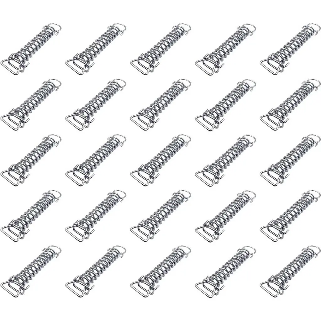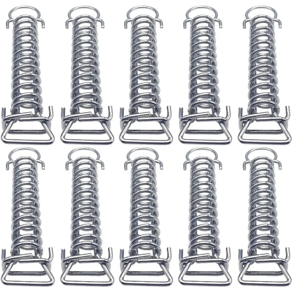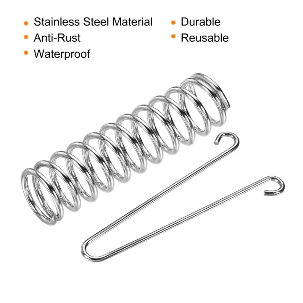 What is this? The tent spring buckle provides protection for the tent, canopy, awning, rain tarp and more. when the strong wind comes, the spring hook can cushion the wind and prevent tents from being damaged by wind. Widely used for outdoor, camping, hiking, boating, fishing, backpacking, etc. What to get? Color: Silver Tone; Material: Stainless Steel; Overall Size: 90mmx30mm / 3.5"x1.2" (L*W); Are there any advantages of the product? Made of stainless steel, anti-rust, and corrosion-resistant. Strong and durable and not easy to bend. The spring buckle is easy to adjust and ensures you have the exact right length and tension. How to use it? Easy to use one end hooks the pin on the ground and the other end hooks the rope. What to notice? Please confirm the required size before purchase.