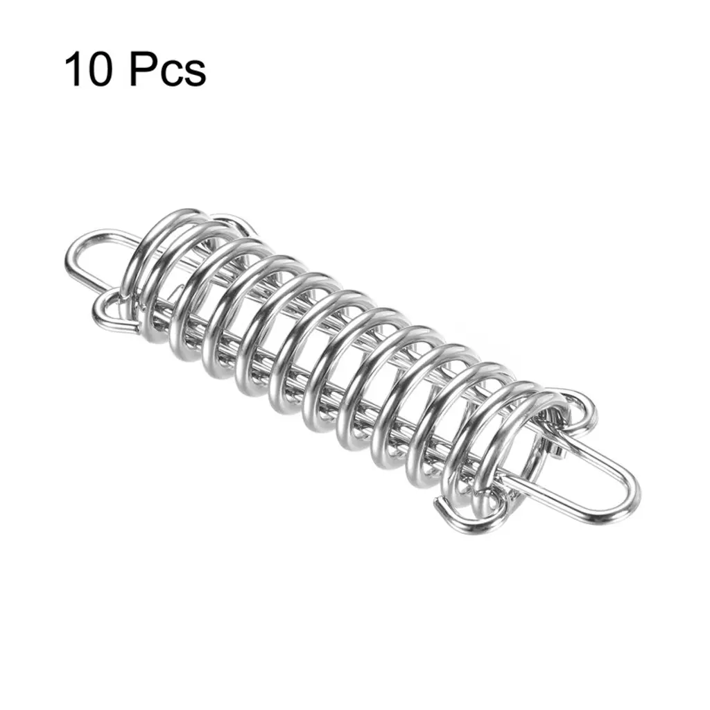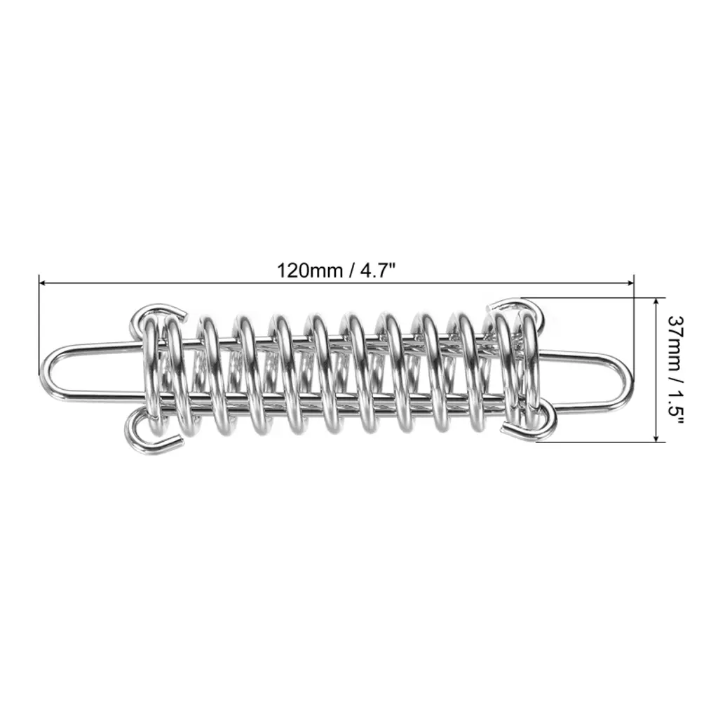 What is this? The tent spring buckle provides protection for the tent, canopy, awning, rain tarp and more. when the strong wind comes, the spring hook can cushion the wind and prevent tents from being damaged by wind. Widely used for outdoor, camping, hiking, boating, fishing, backpacking, etc. What to get? Color: Silver Tone; Material: Stainless Steel; Overall Size: 120mmx37mm / 4.7"x1.5" (L*W); Are there any advantages of the product? Made of stainless steel, anti-rust, and corrosion-resistant. Strong and durable and not easy to bend. The spring buckle is easy to adjust and ensures you have the exact right length and tension. How to use it? Easy to use one end hooks the pin on the ground and the other end hooks the rope. What to notice? Please confirm the required size before purchase.