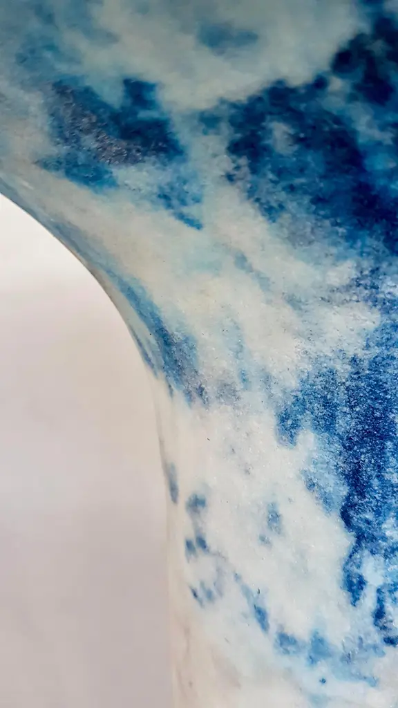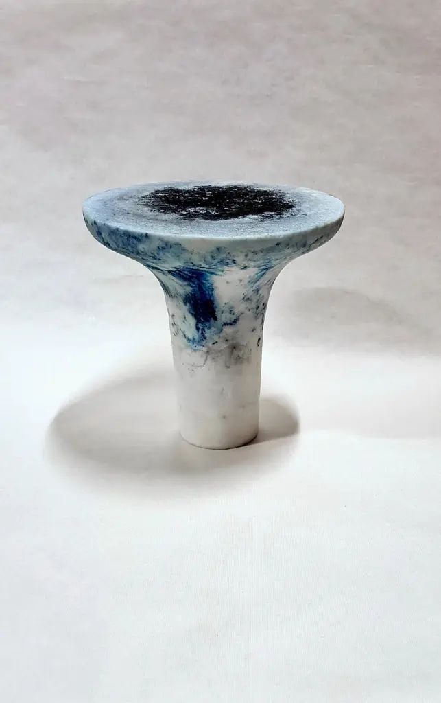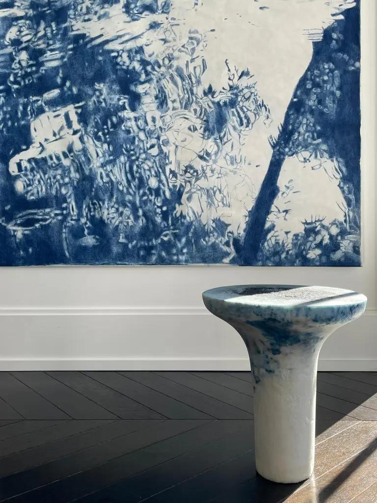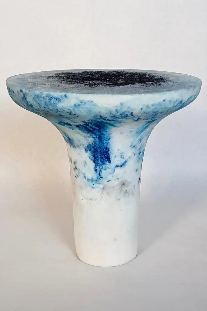 Unique blue marbled salts Gueridon, Roxane LahidjiMaterial: Marbled salts, a unique award winning technique developed by Roxane LahidjiDimensions: 42 x 38 x 38 cmUnique Gueridon.Award winner of Bolia Design Awards 2019 and FD100 and present in the collections of the Design Museum Gent.Lahidji's marbled salts creations in the press:Elle Decoration NL :DDW17- Jan/Feb 2018Object Rotterdam - Feb/March 2018DeStandaard Magazine - June 2018Elle Decoration UK- Sept. 2018Boek Boq - Architecture - Oct. 2018Why material matters - Oct. 2018Roxane LahidjiRoxane Lahidji is an alchemist as much as a designer. She seeks a reconnection to fundamental materials in objects of our daily lives by developing her own transforming and moulding methods. In terms of design, her intuitive methodology associates concepts with material symbolics and consumption or usage habits, which defines a dwelling function and a final shaping.Fascinated by precious surfaces and their story telling, she works in a constant research for meaning in patterns, textures and shades; focusing on liquid and powdered substances she melts, mixes, fusions into solid objects.With the deep concern of reconciliating production and sustainability, her design focuses on disregarded or cheap materials brought to a new life, while twisting low tech methods and traditional crafts techniques.Roxane Lahidji was born in Paris in 1992 and grew up in the French capitale before studying illustration and product design in Strasbourg (HEAR). After her Bachelor (with distinction), she pursued her research for new design values in Design Academy Eindhoven and graduated from the Social Design master department in June 2017.
