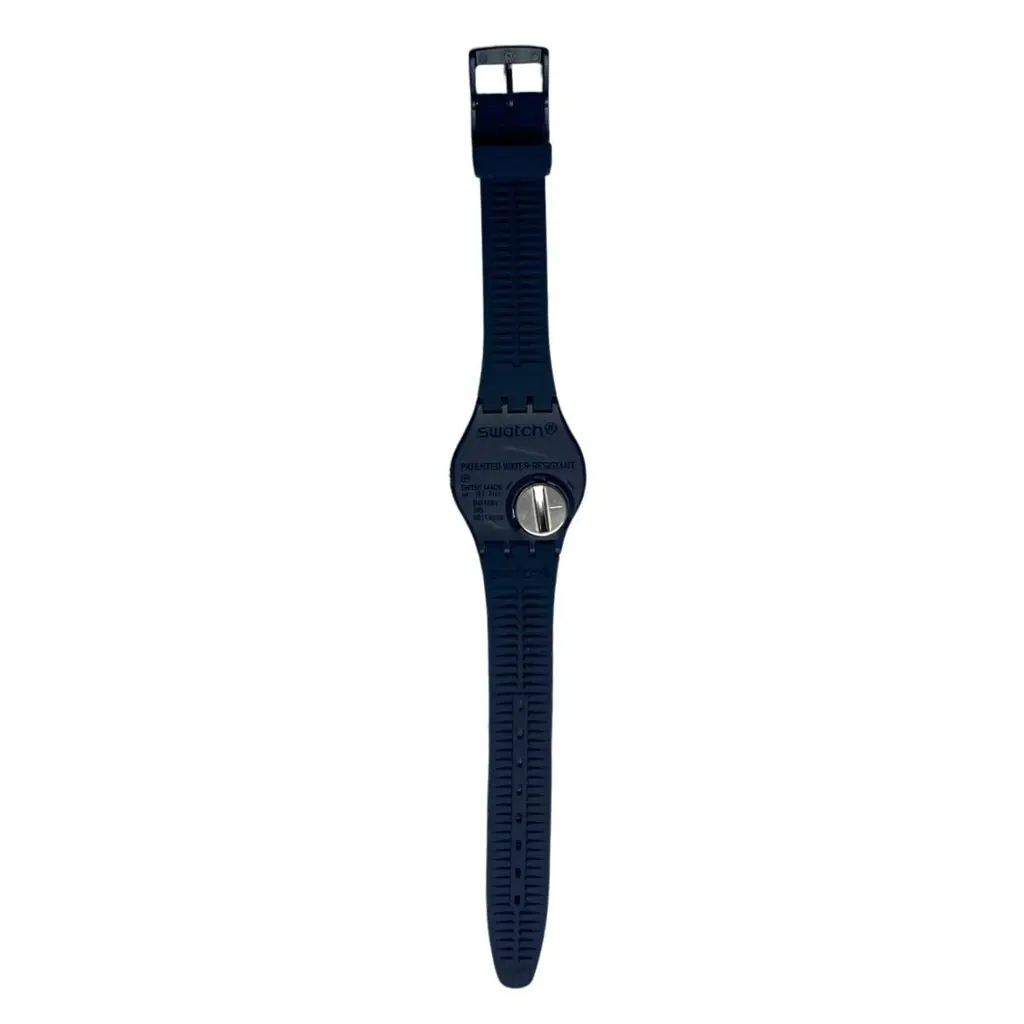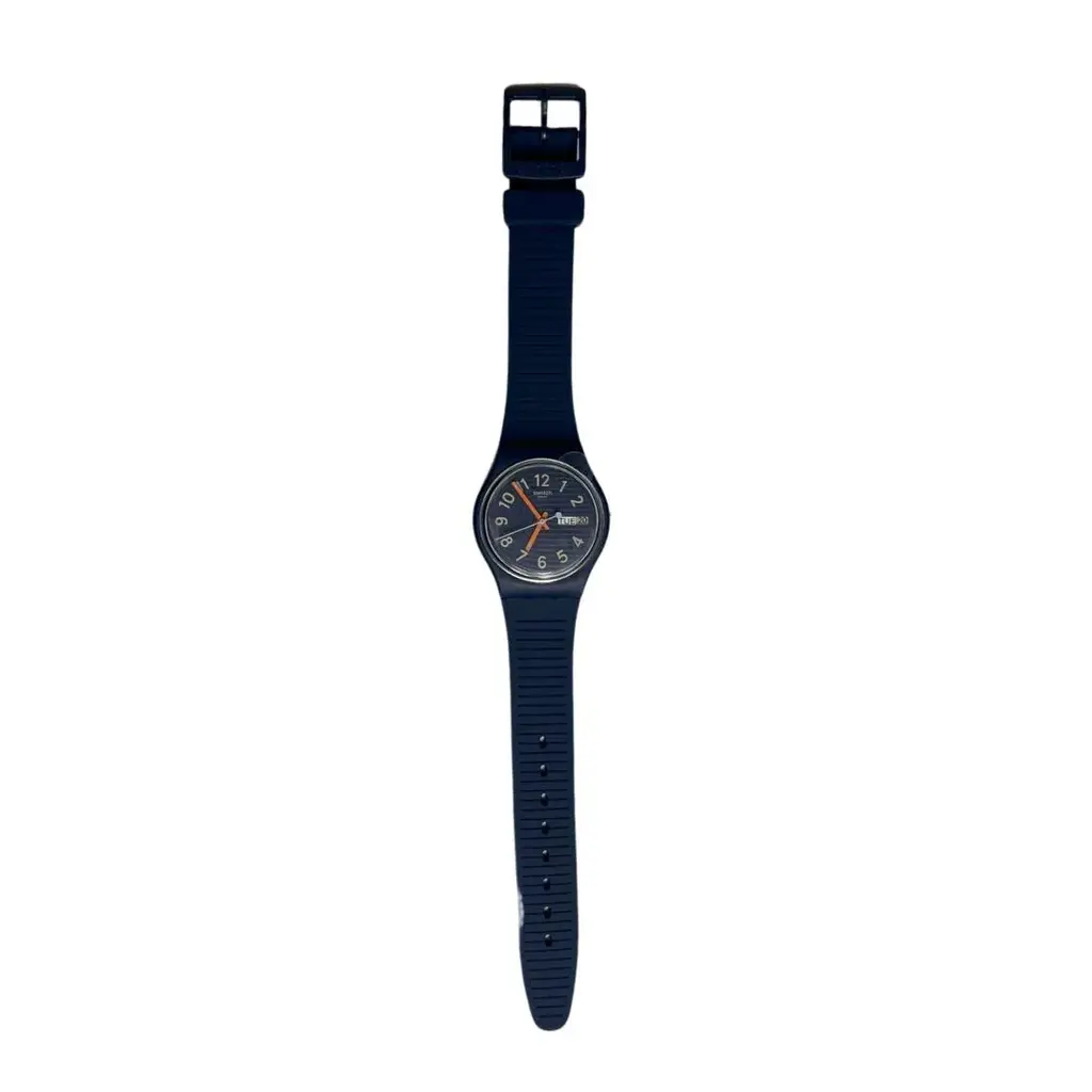 The dial of this dark blue watch features printed beige numerals and a darker blue structure in a biosourced case with biosourced glass. Hands point to the time, and there is a day-date window at 3 o'clock. The matching dark blue strap, loop, and buckle make a stunning tone-on-tone statement.