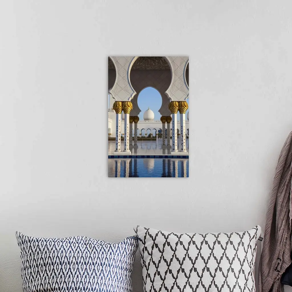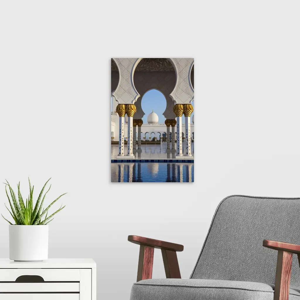 United Arab Emirates, Abu Dhabi, Sheikh Zayed Grand Mosque, Gilded columns and reflecting pool