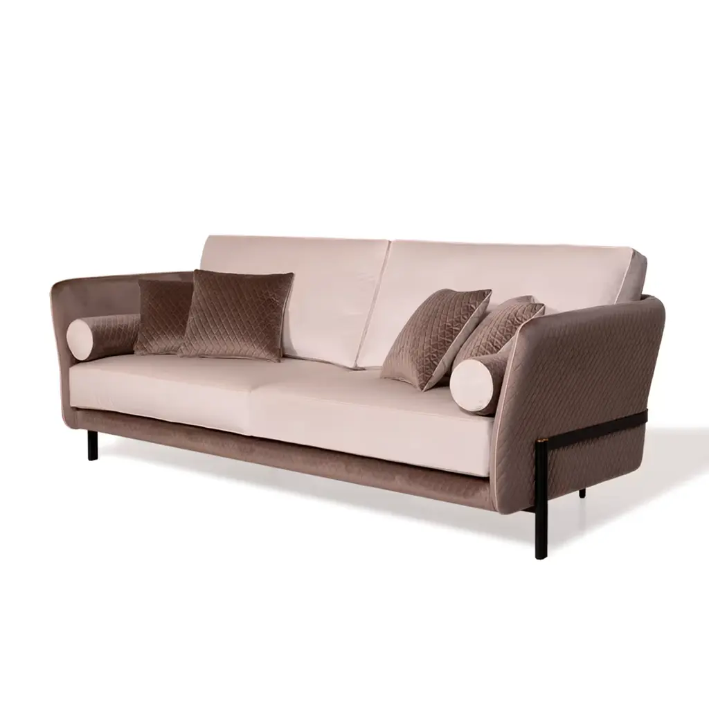 The Universal sofa is one of the new and elegant products designed by the Mantellassi family. The base is made up of two legs in solid satin brass that lift and follow the curved line of the upholstered shell, on which the seats and backrests. The upholstered seats in polyurethane foam in different densities, combined with the back in polyurethane foam covered with a goose-down duvet, give the product maximum comfort. Decorative cushions are not included. Please ask the Concierge for customization options.