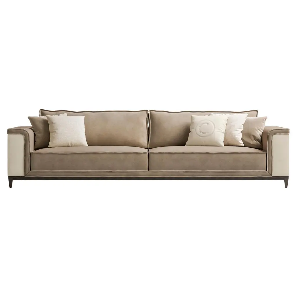 The Universal sofa is one of the new and elegant products designed by the Mantellassi family. The base is made up of two legs in solid satin brass that lift and follow the curved line of the upholstered shell, on which the seats and backrests. The upholstered seats in polyurethane foam in different densities, combined with the back in polyurethane foam covered with a goose-down duvet, give the product maximum comfort. Decorative cushions are not included.