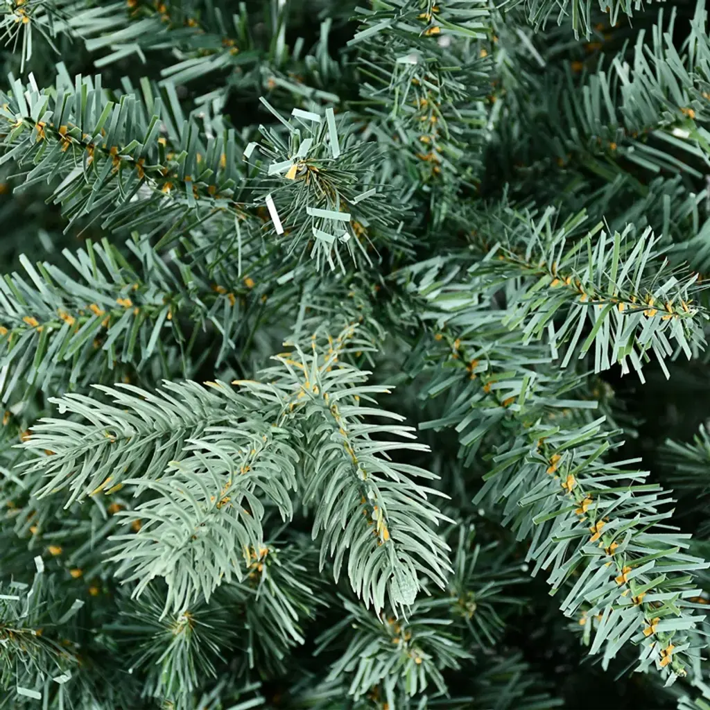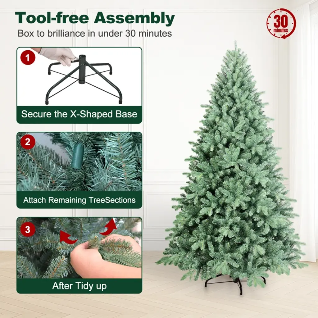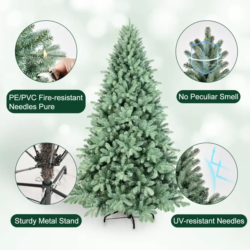 This blue spruce artificial Christmas tree with lights is made from a high-quality mix of PE and PVC branches, ensuring flame-retardant and durability with a classic, traditional appearance. Its hinge structure is built to last, allowing the branches to easily unfold and fold back