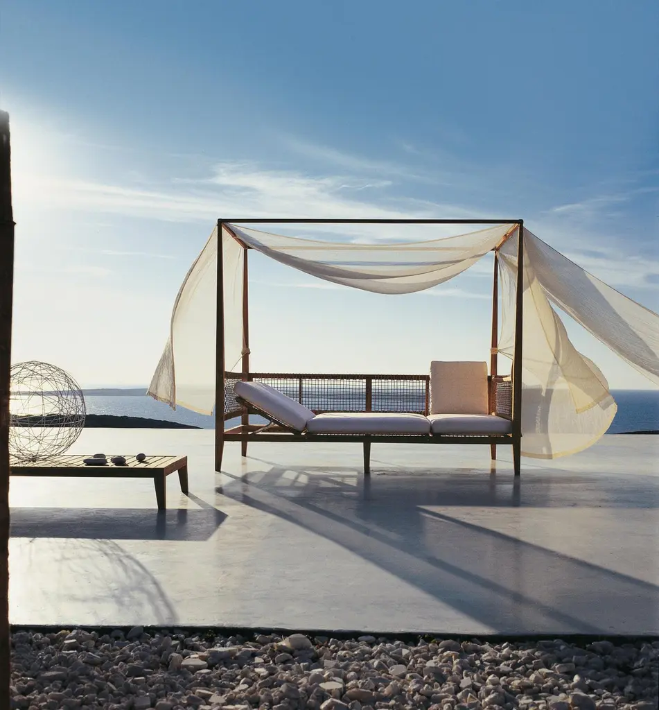 Synthesis is a contemporary collection with a basic design, where the purity of the lines is conveyed through an elegant combination of teak and hand-woven WaProlace® synthetic fibre.Craftsmanship and attention to detail are the distinctive traits of the many products in the collection.The wide mesh weave of the fibre combines functionality and aesthetics in a discreet, sophisticated pattern designed to harmoniously complement the natural space.