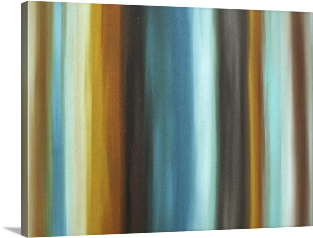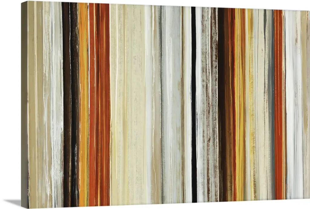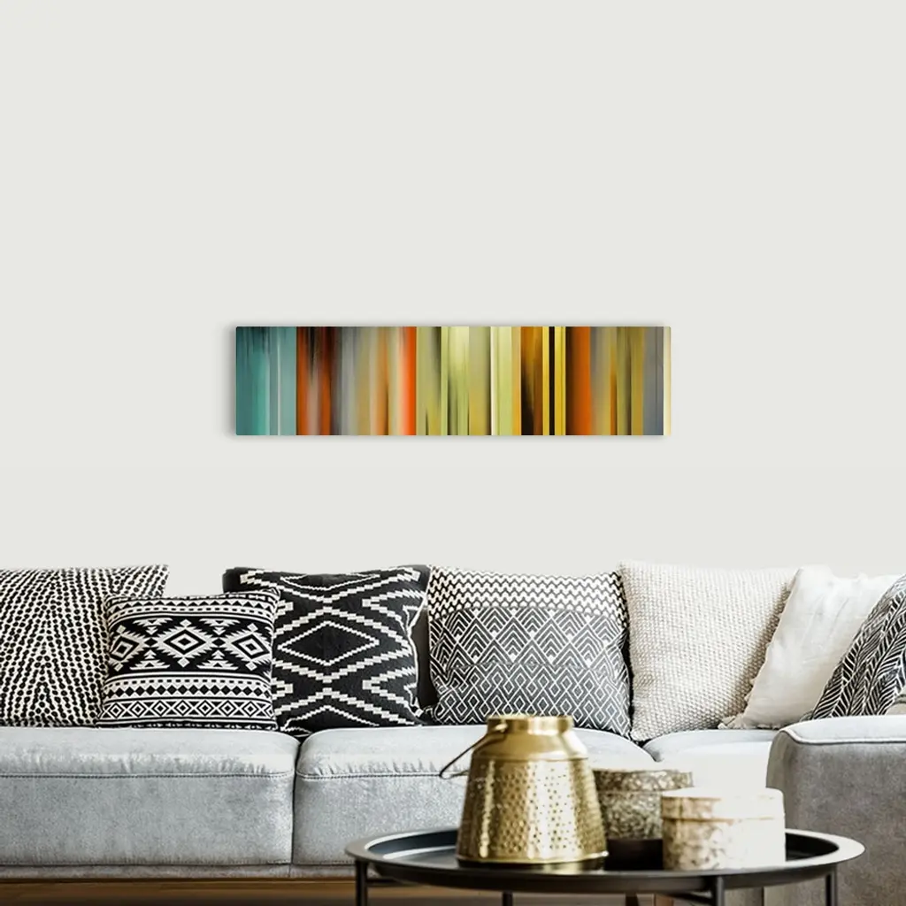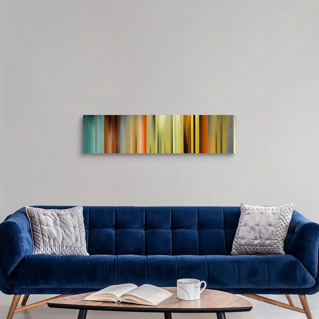 Panoramic abstract art incorporates vertical rectangles of varying widths with a wide range of different colors sheared within each shape.