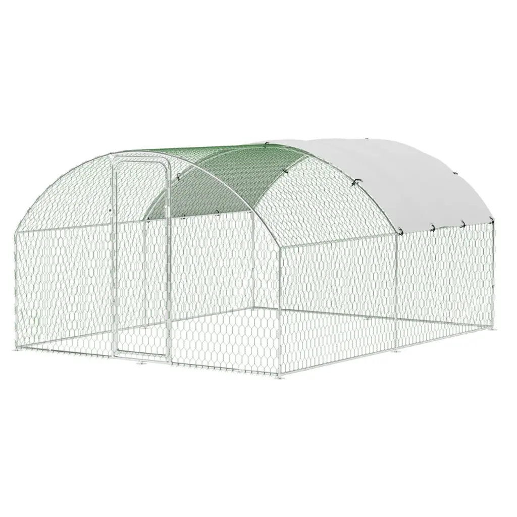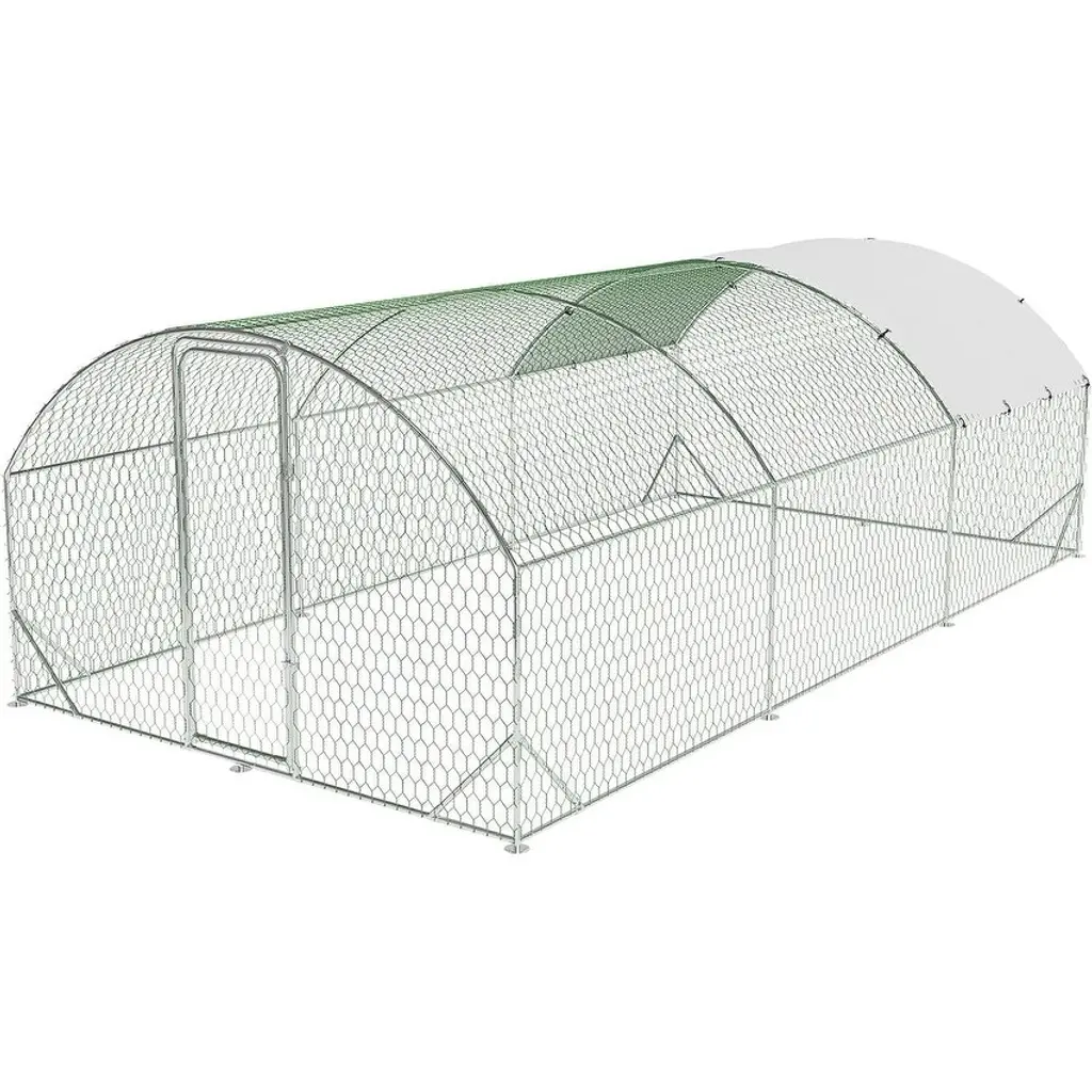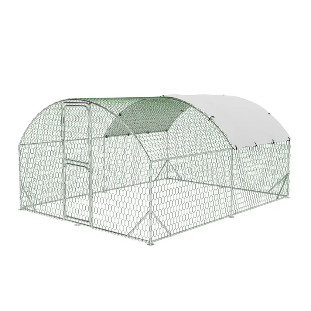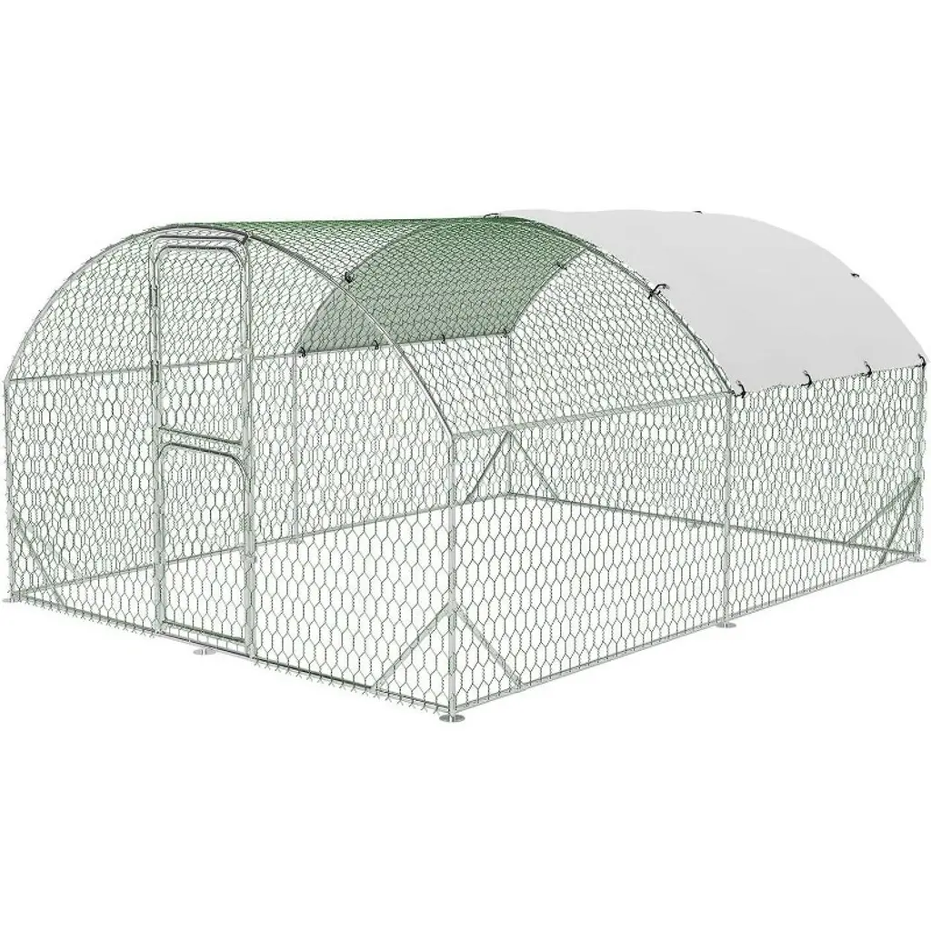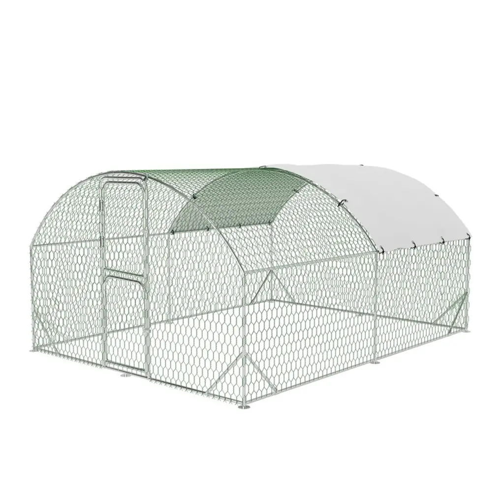 Sturdy Steel Construction for Reliable Security: Our chicken coop is built with a heavy-duty steel frame designed for long-lasting durability and stability. Reinforced with additional support columns and triangular braces, this galvanized steel structure withstands wear and tear, ensuring a secure and reliable home for your animals. Investing in this top-notch quality gives you peace of mind, knowing your pets are protected in a sturdy abode. Secure and Well-Ventilated Wire Mesh: The chicken run features high-quality, coated steel wire mesh that provides both security and optimal ventilation. This design helps prevent escapes and keeps predators at bay while ensuring sufficient airflow for your animals. The combination of safety and ventilation allows your pets to enjoy their space comfortably, while you can rest assured of their well-being. Simple and Straightforward Assembly: Designed for convenience, our chicken coop allows for easy assembly with clear instructions and enhanced pole connections. This user-friendly design minimizes the time and effort required for setup, providing a quick and hassle-free installation process so you can get your pets settled into their new home without unnecessary delays. Versatile Habitat for Various Animals: This spacious metal coop is suitable for a range of small to medium-sized animals, not just chickens. Whether you have rabbits, ducks, cats, dogs, sheep, birds, or even land turtles, this adaptable enclosure offers ample space for play, relaxation, and outdoor enjoyment. It creates a versatile environment that meets the diverse needs of your pets. Protective Anti-UV and Waterproof Cover: Equipped with an anti-UV and waterproof PE cover, our chicken coop ensures maximum protection from the elements. The cover shields your animals from harmful sun rays and rain, while the sloped roof design facilitates efficient drainage of water. This ensures your pets stay safe and comfortable, enjoying a well-protected outdoor space in all weather conditions.