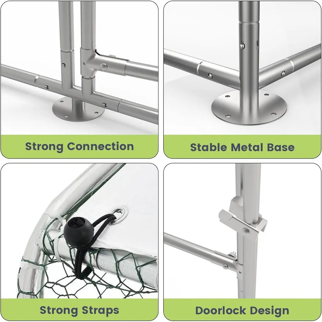 Sturdy Steel Structure: The metal chicken coop features a robust steel frame and galvanizing technology that prevents rusting, ensuring durability for outdoor use. Its sturdy construction provides ample space for your chickens to roam freely, and it is designed to resist damage, extending its lifespan significantly. Waterproof and UV-Proof Cover: The canopy of the coop is made from 210D Oxford cloth, which effectively offers both waterproof and UV-proof protection. This feature safeguards your chickens from extreme weather conditions, including rain, snow, and frost, ensuring their comfort and safety year-round. Safe and Convenient Design: The chicken coop's walls are constructed from PVC-coated hexagonal wire mesh that is strong and resistant to damage. The small gaps in the mesh ensure good airflow while protecting the chickens from predators. Additionally, it includes a reinforced locking system and a sturdy door for easy access, maximizing security for your pets. Easy to Assemble: Our large chicken coop is designed for straightforward installation, complete with detailed instructions. The quick connection frame and clear guidance allow customers to save time during setup, making the assembly of this metal chicken coop both quick and hassle-free. Versatile Cage for Various Pets: This spacious outdoor metal chicken coop is not only suitable for chickens but also ideal for a variety of small to medium-sized animals. It provides plenty of space for play and rest, making it a practical choice for rabbits, ducks, cats, dogs, sheep, birds, and turtles, accommodating diverse pet needs in one versatile cage.