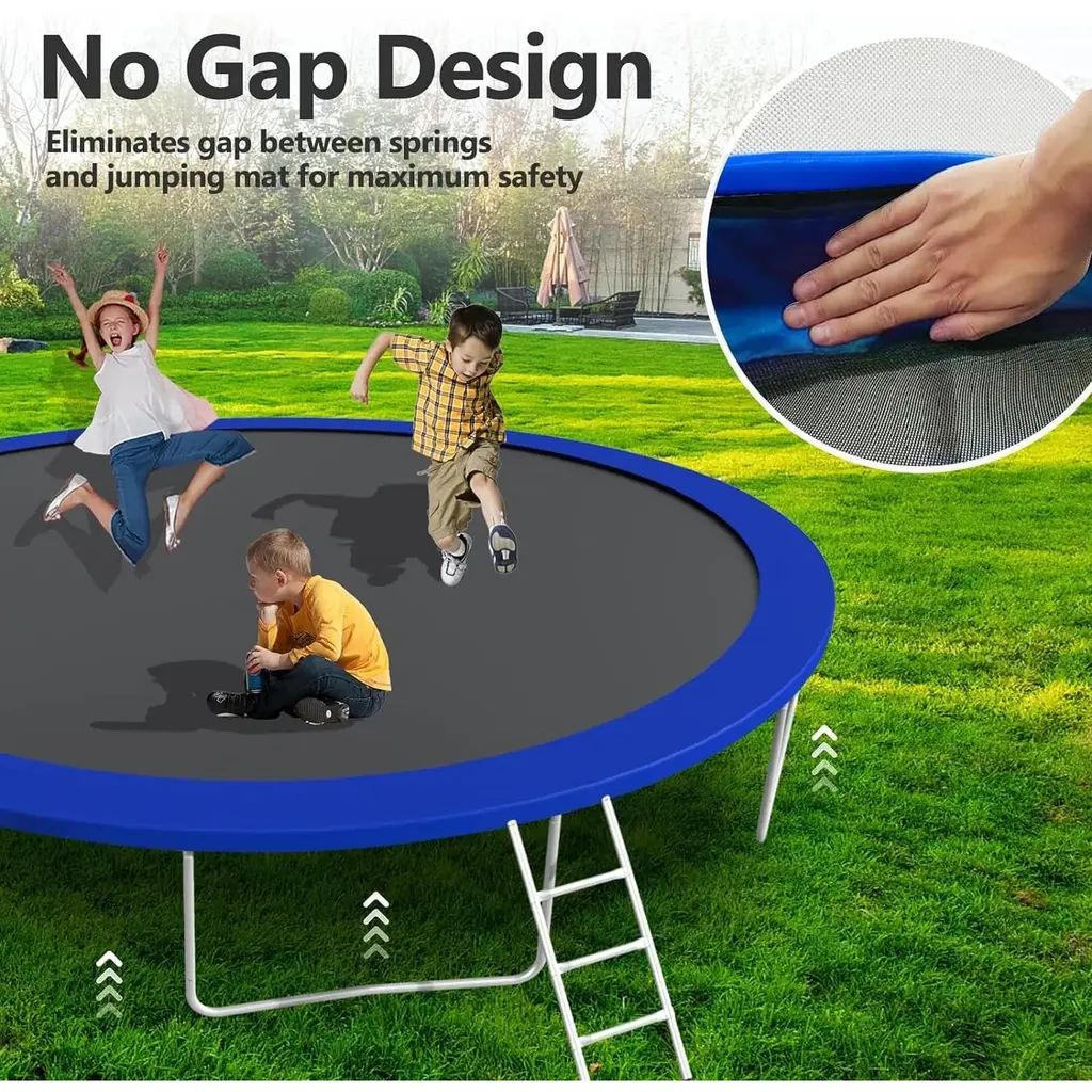 【Come with Basketball Hoop and Ladder】This outdoor trampoline with basketball hoop is more fun than recreational trampolines, kids can not only bounce on the 8ft/10ft/12ft trampoline but also dunk easily. It's will be the great time for kids!【Trampoline Accessories Outfits】Our big 8ft/10ft/12ft trampoline for kids and adults comes with a whole set of accessories which includes: 4 ground stakes, 1 trampoline sprinkler, 1 led light. Bonus packs bring your kids endless giggles【Reinforced Steel Frame】The frame of our large 8ft/10ft/12ft trampoline for adults consists of heavy-duty galvanized steel, rust-resistant springs and thickened W-shaped legs, increasing frame stability and preventing structural twisting【Safety is NO.1】Safety always comes top priority. Our 8ft/10ft/12ft trampoline for kids have been tested and approved with ASTM F381, ASTM F2225-15(R2020)Standard Safety Specifications.You can ensure that our trampoline is safe for your family. Let you and your kids play safely on the trampoline【Huge Weight Capacity】The 8ft/10ft/12ft outdoor trampoline has a capacity of 3-5 kids. Kindly Note: We suggest that the alone user maximum weight does not exceed 300LBS, for prevent injuries caused by uneven strength on the trampoline
