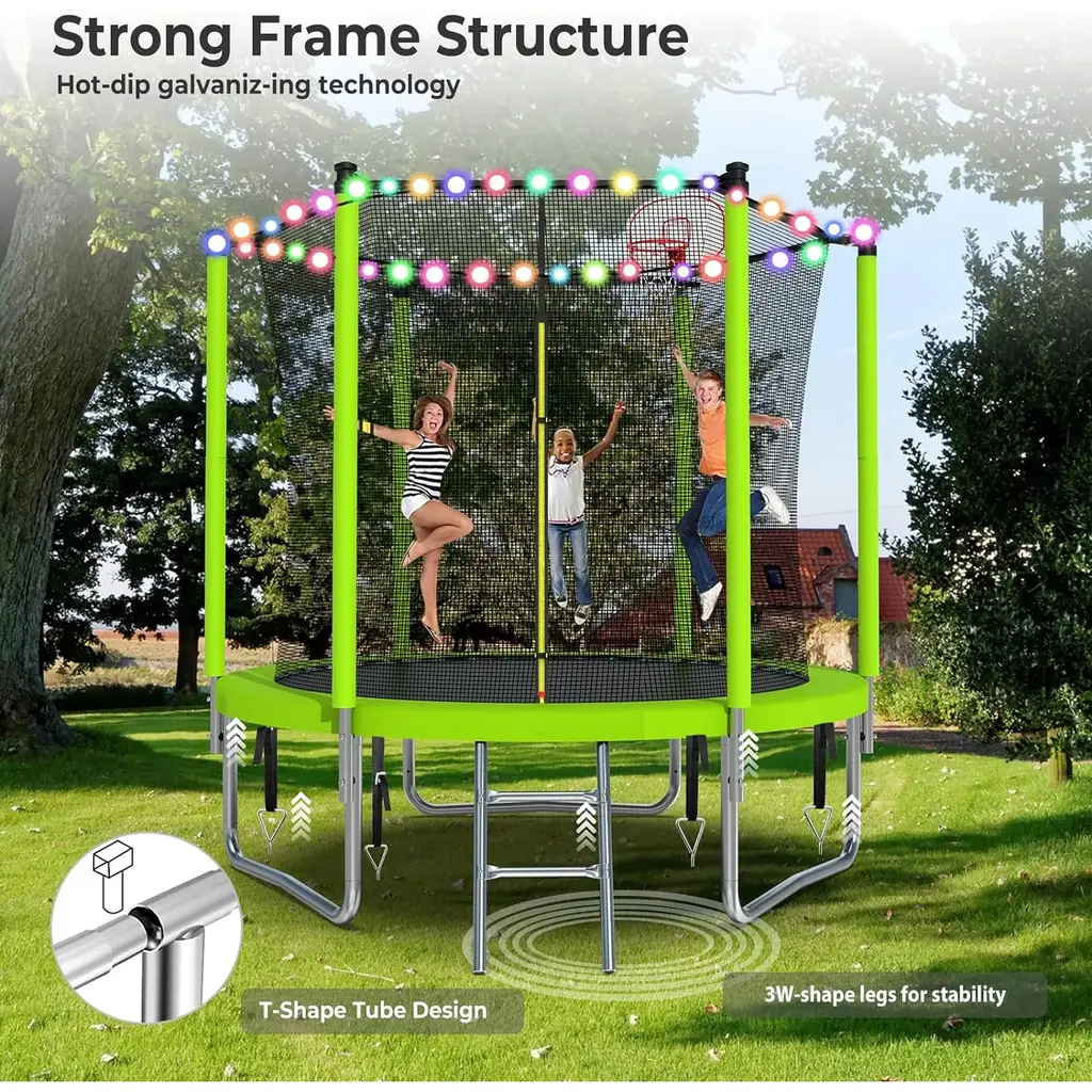 【Come with Basketball Hoop and Ladder】This outdoor trampoline with basketball hoop is more fun than recreational trampolines, kids can not only bounce on the 8ft/10ft/12ft trampoline but also dunk easily. It's will be the great time for kids!【Trampoline Accessories Outfits】Our big 8ft/10ft/12ft trampoline for kids and adults comes with a whole set of accessories which includes: 4 ground stakes, 1 trampoline sprinkler, 1 led light. Bonus packs bring your kids endless giggles【Reinforced Steel Frame】The frame of our large 8ft/10ft/12ft trampoline for adults consists of heavy-duty galvanized steel, rust-resistant springs and thickened W-shaped legs, increasing frame stability and preventing structural twisting【Safety is NO.1】Safety always comes top priority. Our 8ft/10ft/12ft trampoline for kids have been tested and approved with ASTM F381, ASTM F2225-15(R2020)Standard Safety Specifications.You can ensure that our trampoline is safe for your family. Let you and your kids play safely on the trampoline【Huge Weight Capacity】The 8ft/10ft/12ft outdoor trampoline has a capacity of 3-5 kids. Kindly Note: We suggest that the alone user maximum weight does not exceed 300LBS, for prevent injuries caused by uneven strength on the trampoline