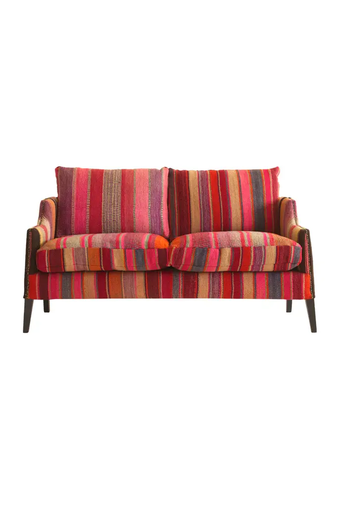 Bring the warmth and joy of the Medina into your home with this beautiful and colorful sofa upholstered in original Moroccan textiles. Made of natural and bio cactus silk thread produced by the following process: fibers are collected from the aloe vera plant, spun, and woven. The thread is then dyed in beautiful shades, and hand-loomed to make each piece wholly unique.When you have placed your order, our Design Support Team will contact you via email with images of each Regal we have available, so you can choose your very own individual sofa!Download Specification Sheet