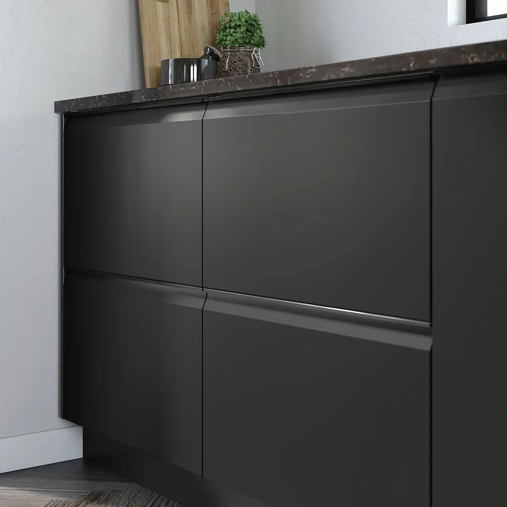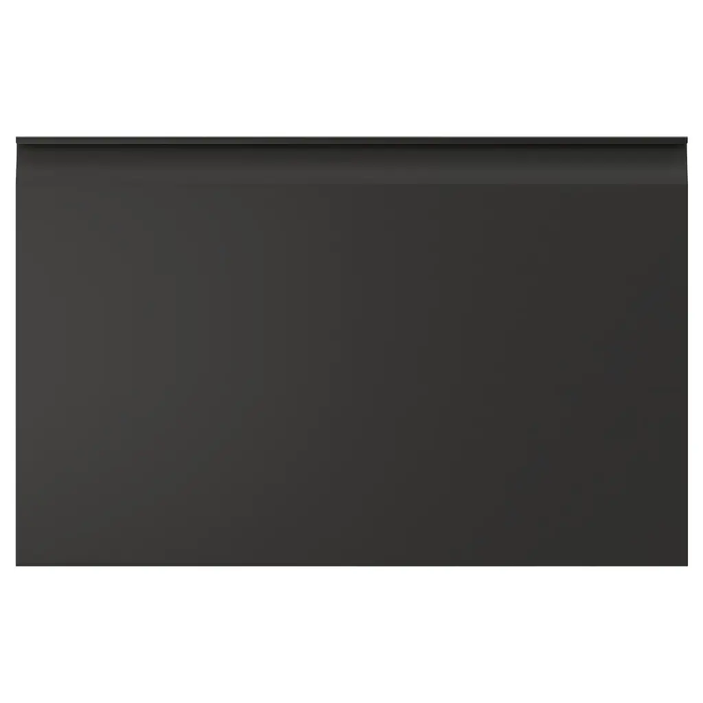 UPPLÖV Drawer front - matte anthracite 24x10 ". The chamfered edge and same-tone metal handle catch the light in the room and creates a unique expression. Made of recycled wood dressed in a foil made mainly of recycled plastic. Fits SEKTION kitchen series. Handle included.