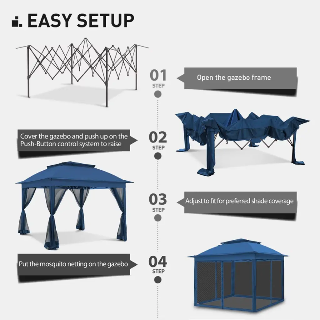The Pop-Up Gazebo with Mosquito Net has an elegant design with a well-ventilated double-layer roof made from 150D Oxford fabric. A durable powder coated steel frame supports the ventilated awning and the straight leg frame provides 121 square feet of shade so you can enjoy the outdoors while staying cool. The mosquito net can be retracted or lowered at any time to prevent mosquito bites and give you privacy. We've also included a handy storage bag for easy transport. We're sure you'll be relaxing in your new favourite outdoor space in no time.