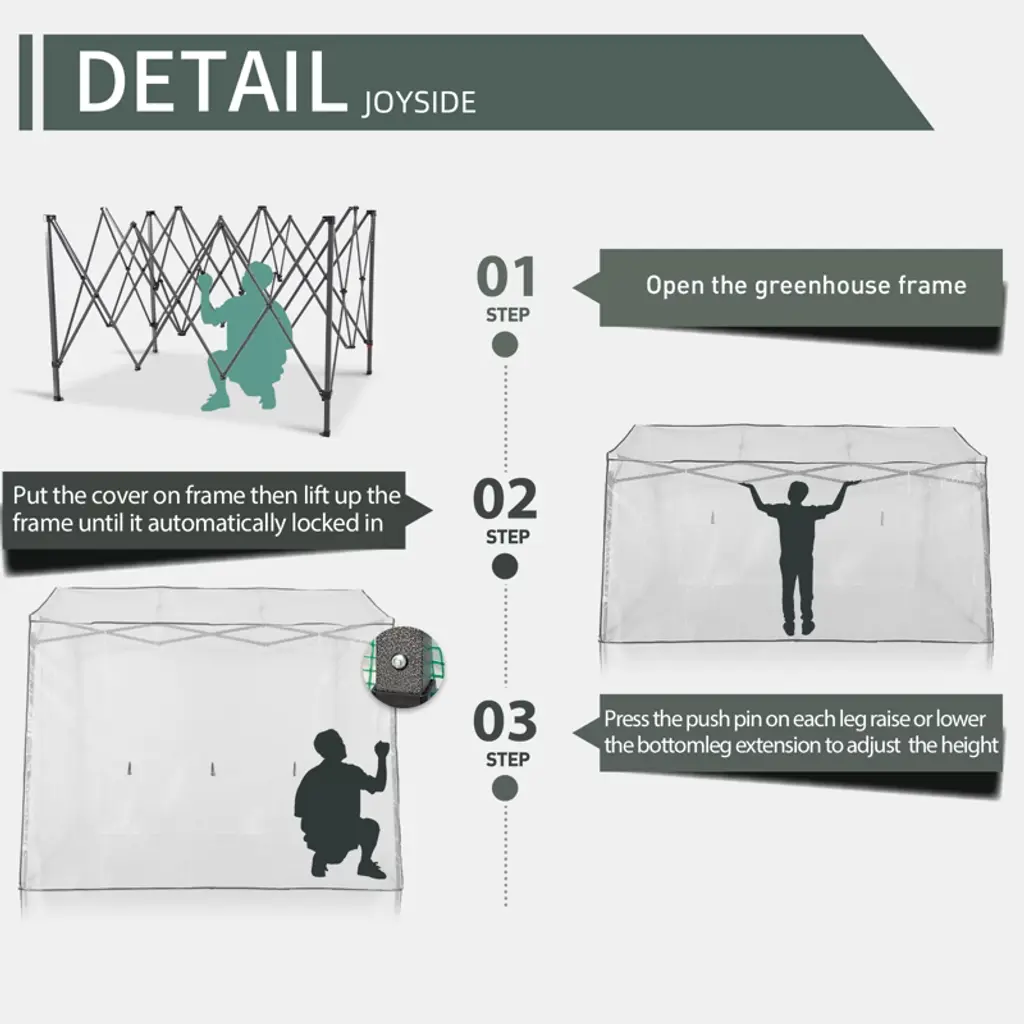 The Portable Greenhouse with durable PE fabric softens and traps sunlight and insulates your plants to keep them safe inside. This easy to set up greenhouse converts into a pop-up canopy in seconds. The innovative dual use frame is ready to use out of the box and can be erected in seconds thanks to the simple assembly technique. The tunnel shape encloses a large space to grow a variety of plants comfortably and leaves plenty of room for you to tend to them. It will be the perfect addition to your garden and can help to enhance your green thumb. It is a great choice for both new and experienced gardeners.