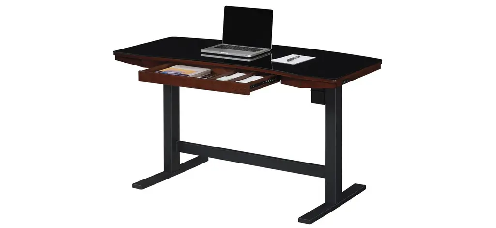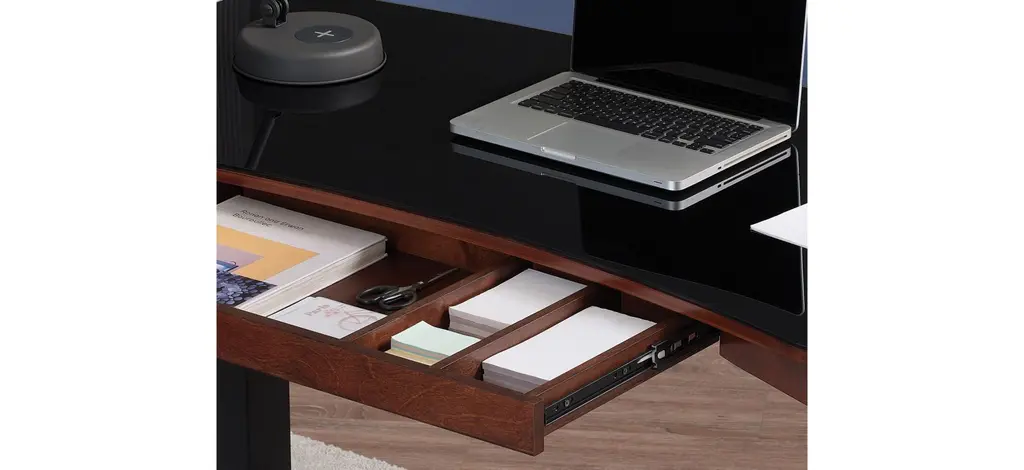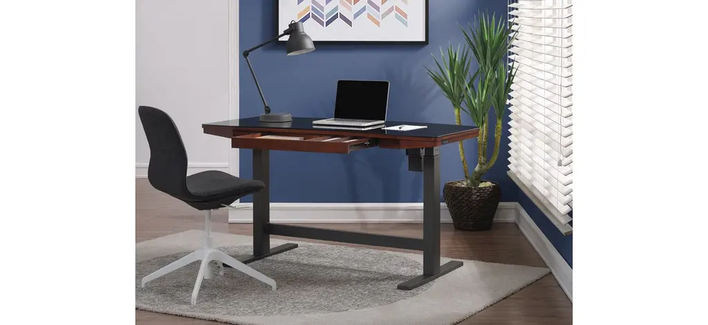 The modern and multifunctional Uptown Loft adjustable-height features a height range from 29.4” to 47”, and three programmable height settings, selectable with the Illumitouch seamless control panel on the ergonomic glass top. Make healthy choices and enjoy the most innovative work space for an active life with furniture that moves the way you do. Eco Mode puts the display to sleep five seconds after the controls are touched. For a reminder to stand up, set an alert with the GetActive timer. To avoid accidentally adjusting the height, lock and unlock the touch controls by pressing the lock button on the right side. Ensure devices stay powered with an integrated, multiport charging station, including three 2.4 amp USB inputs to simultaneously power up to three devices at full speed. The glass top is dry erase compatible, so you can keep reminders or today’s goals in sight at all times. The large, partitioned drawer conveniently stores desk supplies to keep essentials in reach.