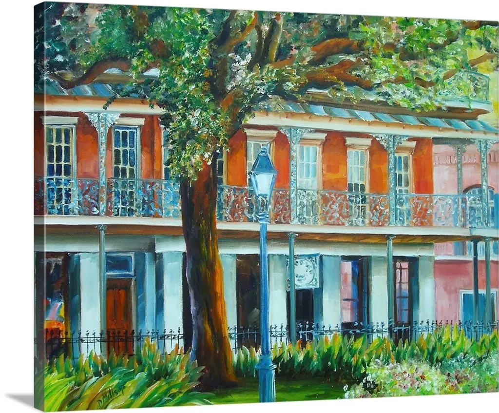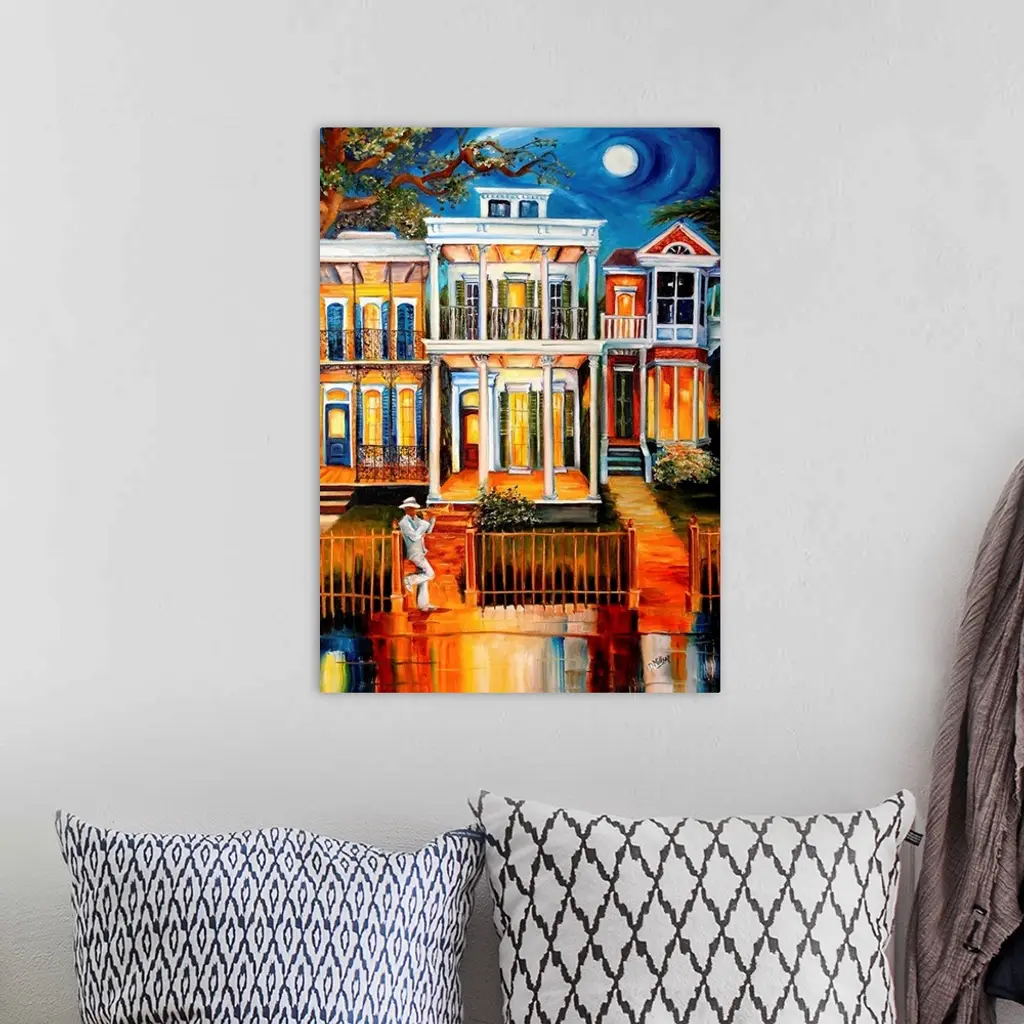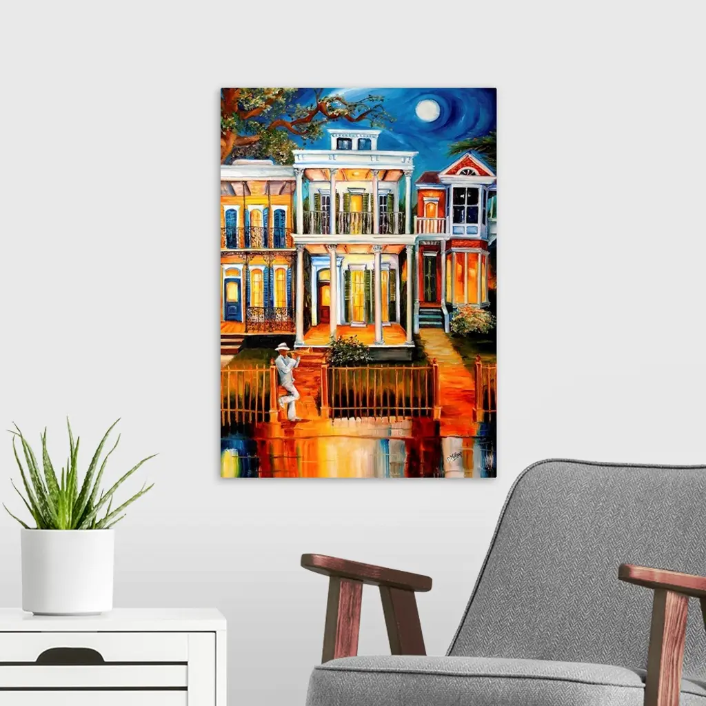 A colorful work of art that shows three houses lining a street in New Orleans with a trumpet player leaning on the fence in front of the houses and playing his instrument.