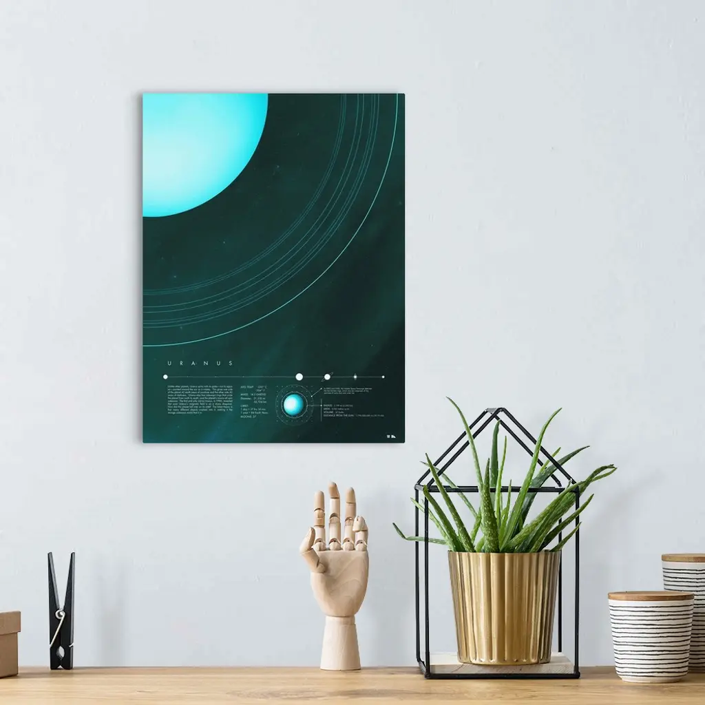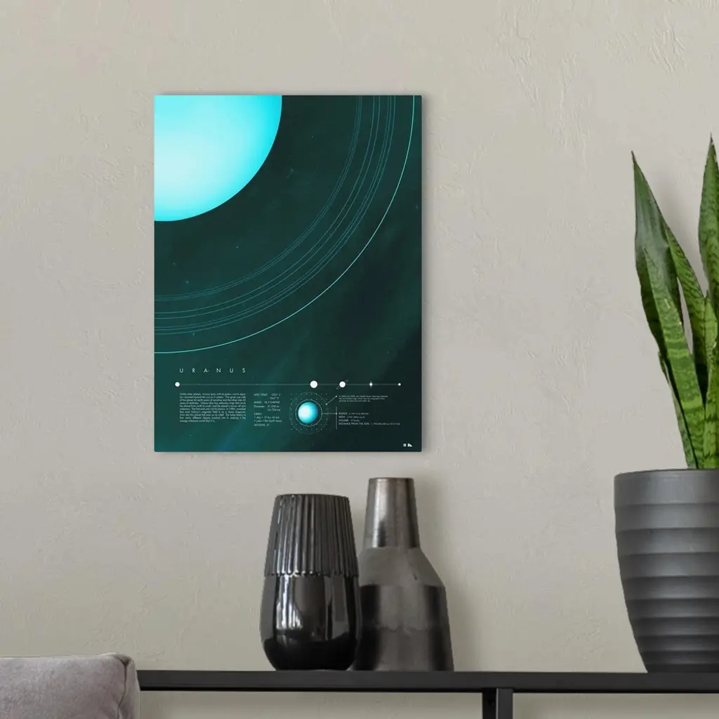 Educational graphic poster of Uranus with written facts at the bottom including average temperature, mass, diameter, orbit, and a diagram. Write up reads: "Unlike other planets, Uranus spins with its poles?not its equator?pointed toward the sun as it rotates. This gives one side of the planet 42 earth years of sunshine and the other side 42 years of darkness. Uranus also has sideways rings that circle the planet from north to south, and the planet?s moons all spin sideways. The first and only visit to Uranus, in 1986, revealed that even Uranus?s magnetic field is on a sharp diagonal. How did this planet fall over on its side? The latest theory is that many different objects crashed into it, making it the strange sideways world that it is."�