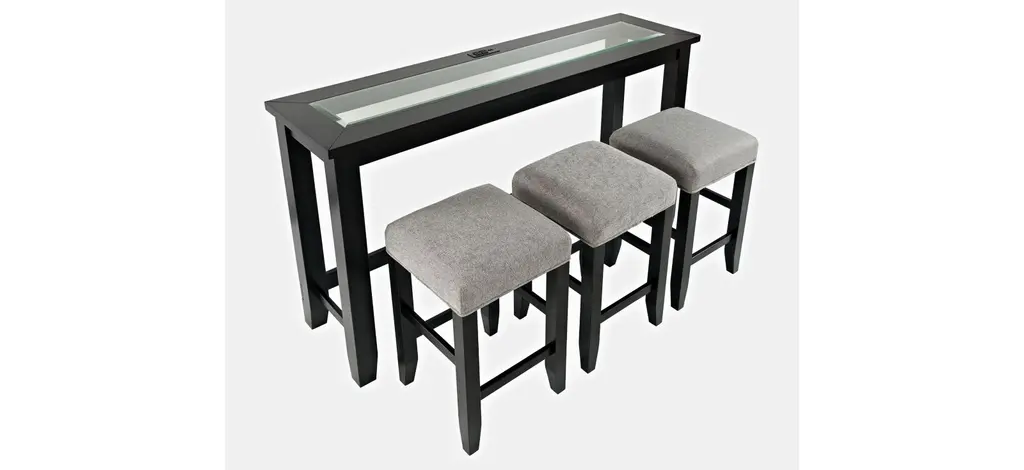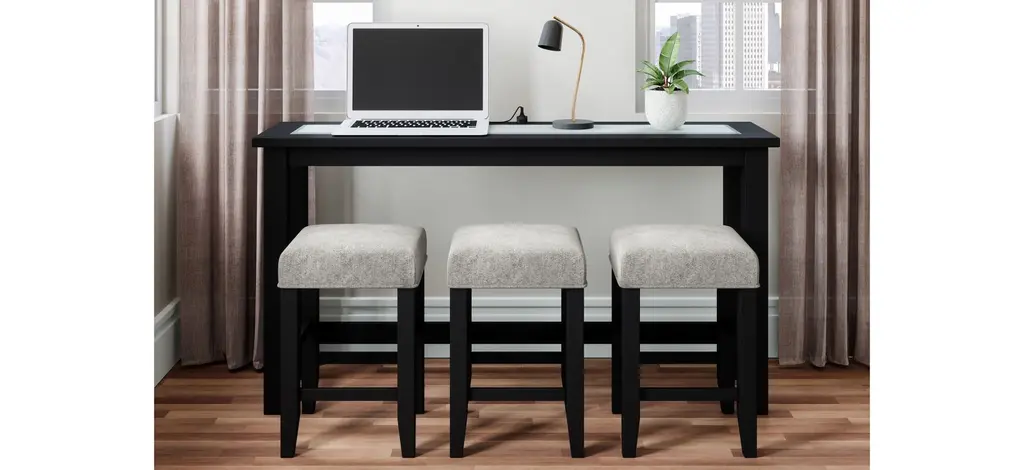 Contemporary style with a solid tempered glass inlay, this Urban Icon Dining Set with USB charging features, three unique color options and three matching barstools are included. Perfect for additional seating behind a couch or against a wall, the built in USB Charging and Power Outlets for all your devices makes this set perfect for entertaining guests or everyday use. Available In White, Black, and Merlot finishes.