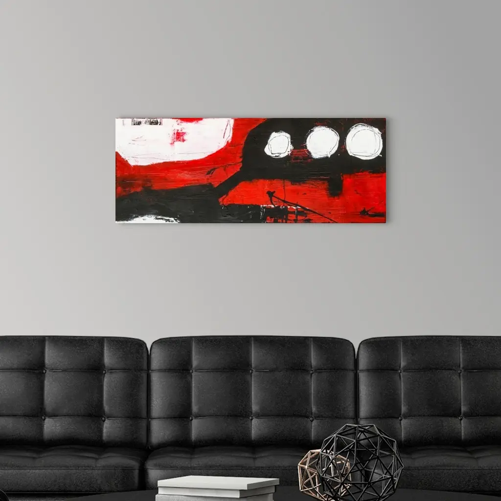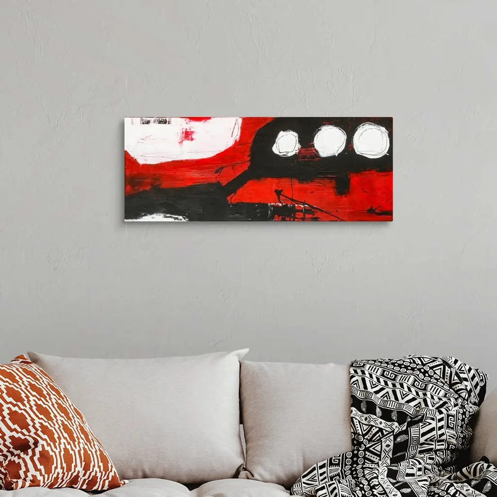 A large abstract with bright red, white and black hues in textured paint. Black paint is dividing across the red, with 3 white circles overlapping on the right.