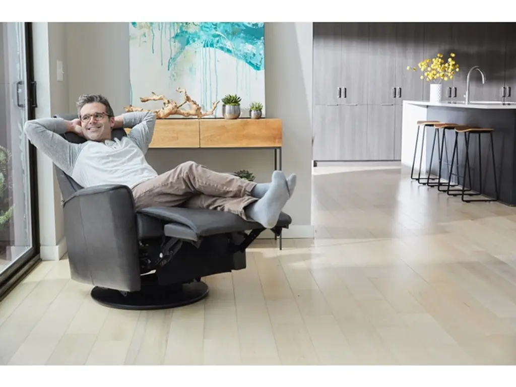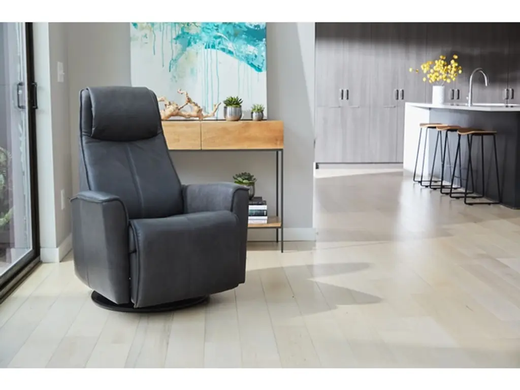 The Fjords® Urban swing relaxer, features an adjustable headrest (see Miami for height adjustable headrest) and manual release headrest angle, makes the seating experience ergonomic and gives your lower back correct support. Available in a wide array leathers and select fabrics. Urban is a swivel/glider/rocker recliner available in motorized and manual versions. Urban is available in small and large sizes. The swivel base is exclusively available in black. The Fjords Urban swing relaxer, featuring an adjustable head pillow and manual release headrest angle, makes the seating experience ergonomic and gives your lower back correct support. Available in all our leathers and select fabrics, the Urban is a swivel/glider/rocker recliner available in motorized and manual versions. The design is available in two sizes, small and large. Black base is standard on Urban. Fjords has a massive collection of recliners with matching ottomans. Check out their Nordic sofa too! INSPIRED BY NORWEGIAN NATURE SINCE 1941 Fjords has designed and manufactured furniture for 70 years. The two brothers Otto and at Mindor Hjellegjerde started it all in the fjord village Sykkylven in Norway In 1946, the third brother, Ingvar, joined the business. With a fierce dedication and great skill, the brothers managed to build a business that has become one of the largest furniture companies in Norway. They have grown from a small family business in a basement to what they are today, a company spread over four continents. QUALITY AND CRAFTSMANSHIP Through all these years, they have produced comfortable quality furniture based on good craftsmanship and Norwegian design. We are proud that the furniture from Fjords are produced with the same dedication and skill as in 1941. INSPIRATION What is it that makes Fjords different from other furniture manufacturers elsewhere in the world? Is it the contrasts landscape that surrounds them, where the endless motion of the ocean meets the strength of the mountains? Or is it the light in Norway – constantly changing – sometimes light, sometimes dark, unable to exist without the other? Both yes and no. The nature around them is robust and what they make is solid. The nature around them is generous – their furniture is made for generous comfort. COLORS & MATERIALS Choosing the right fabric or leather on a piece of furniture should be logical and exciting. Therefore, Fjords has put together a large number of modern fabrics, leathers and materials within the corresponding colour nuances that will make it easier to be able to make your individual choices. All fabrics, leather and material samples are available to be seen in our showroom.