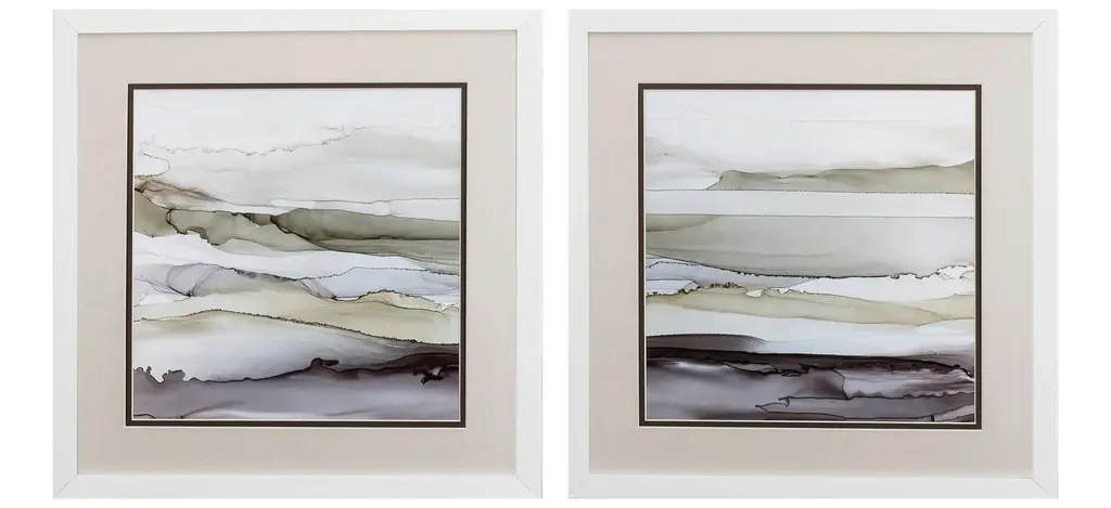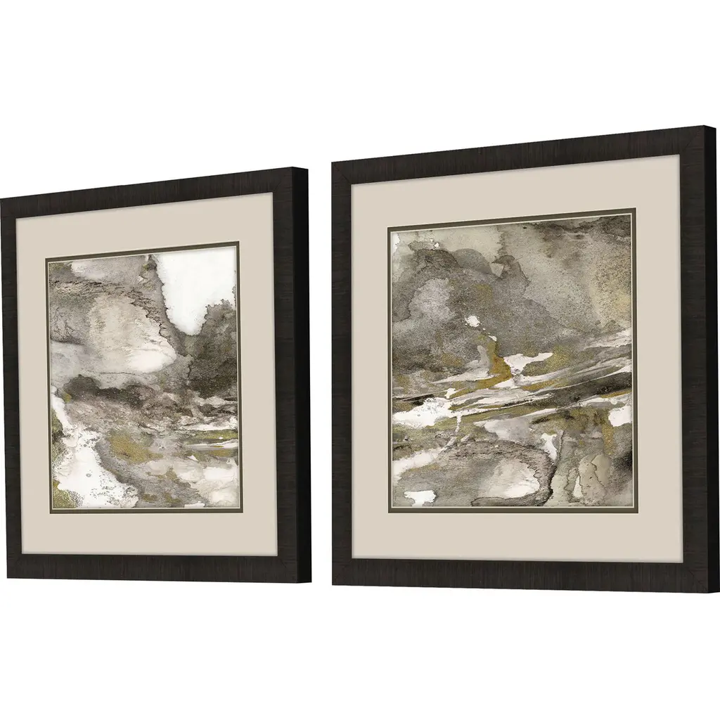 Swirling contemporary abstracts are matted in oyster. Framed in a dark espresso wood finish moulding.