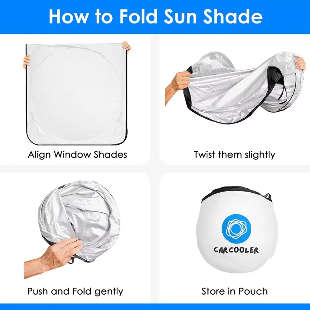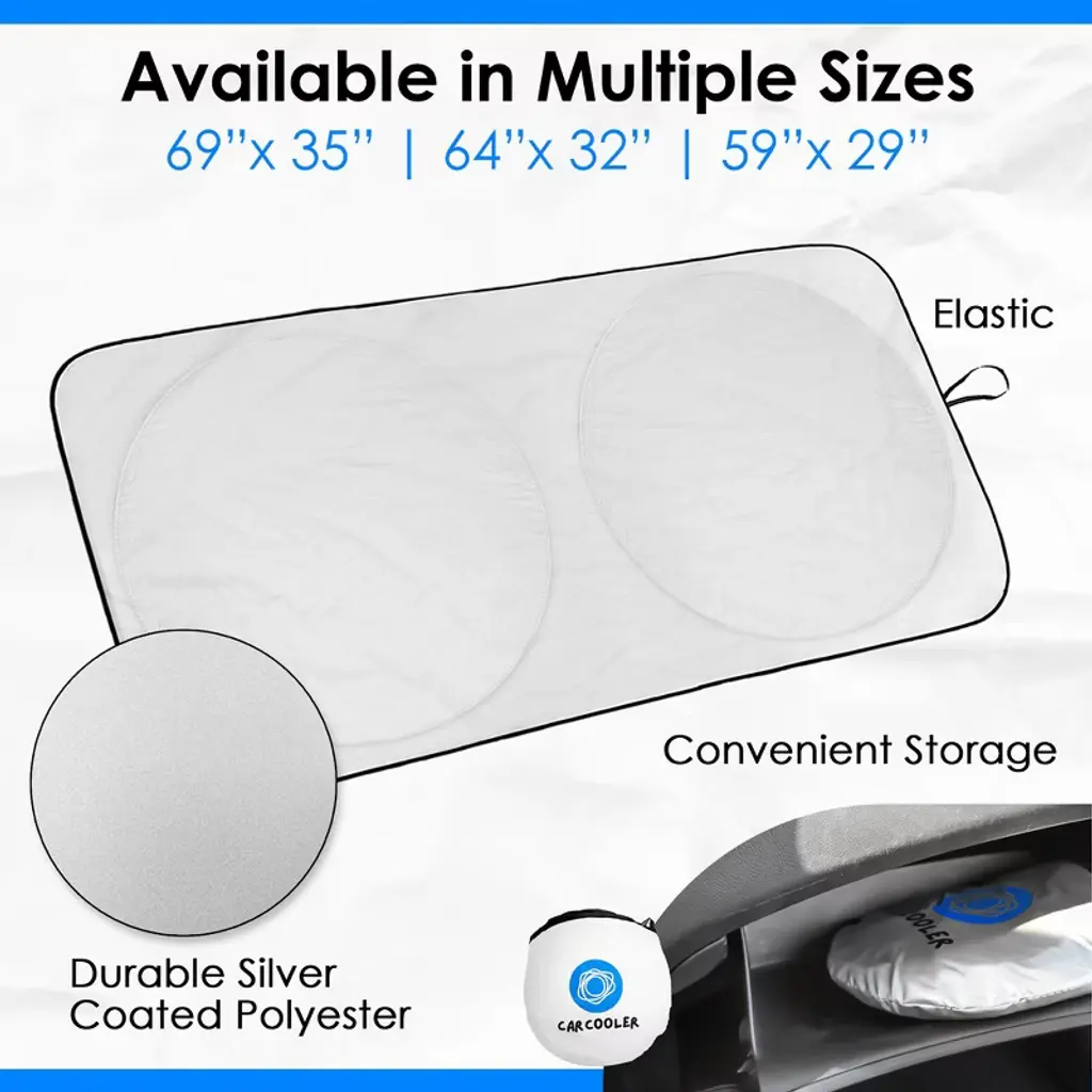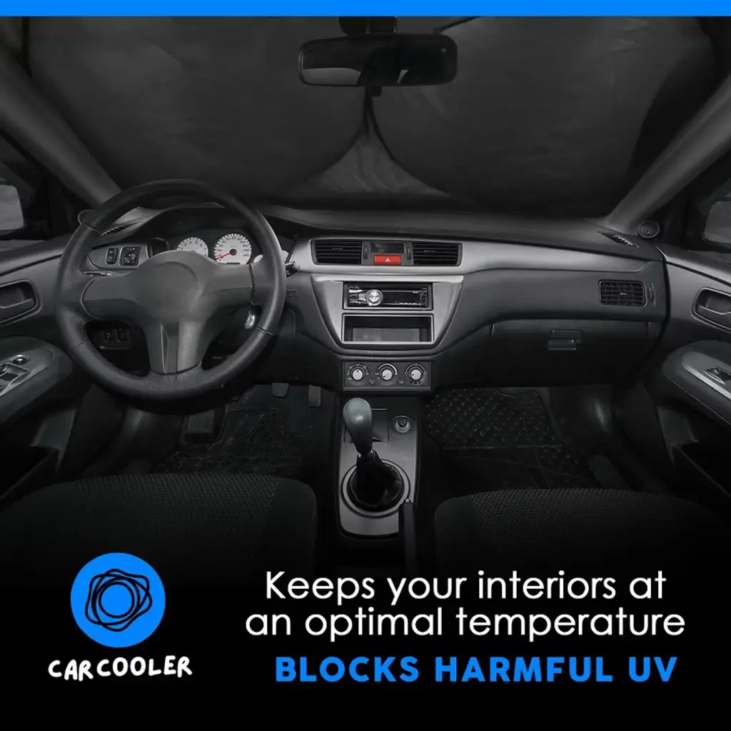 Protect your car and yourself from the relentless heat with the CarCooler Sun Shade. This essential car accessory ensures that the sun won't destroy your car or, worse, cause you injury. Our windshield visors are designed to shield you and your vehicle from the harmful effects of leaving your car unprotected under the burning sun. Experience the comfort of a cooler car and avoid the searing pain of touching a burning hot steering wheel. The CarCooler from Urban Sombrero saves you time and prevents unwanted burns, making it easier to get on the road quickly and comfortably. The CarCooler features a convenient foldable design that tucks away neatly when not in use. For added convenience, it comes with a small storage bag marked with clear and easy usage instructions, allowing you to fold and store it in a jiffy. Available in multiple sizes, the CarCooler provides versatile protection for both the front windshield and the rear window of your car. Invest in the CarCooler Sun Shade for comprehensive protection and a more comfortable driving experience.