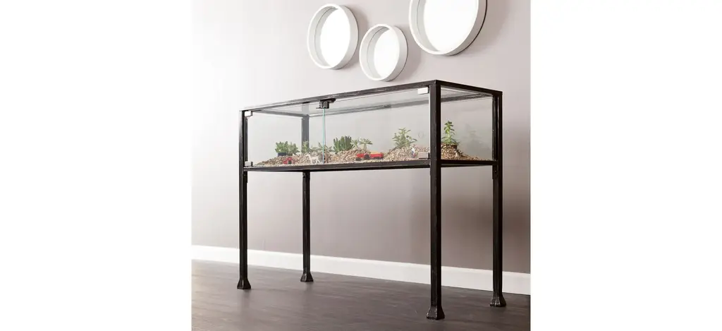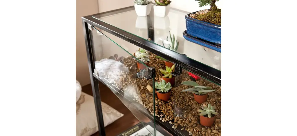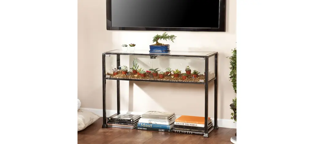 Bring gardening fun into your home with this Urbana Display Console table. Black frame with silver distressing and glass panels creates a universal look that complements many styles and decor. This terrarium style design is perfect for indoorgardens or displaying special mementos. Best for lowlight houseplants and succulents, this sleek console table is a great conversation starter that showcases a world of your own.