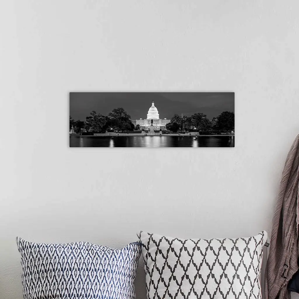 Panoramic photograph of the U.S. Capitol Building at dusk with the Capitol Reflecting Pool.