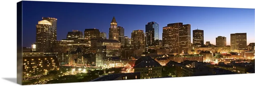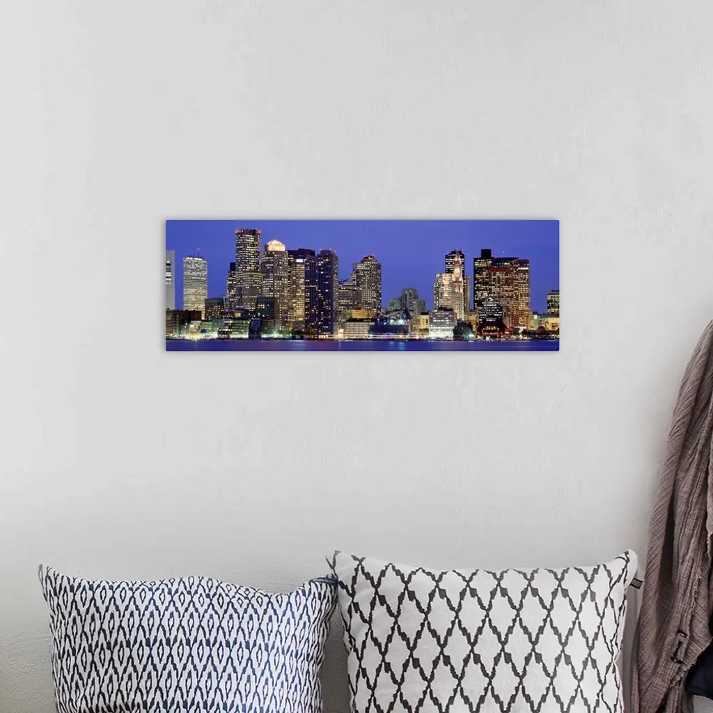 A panoramic photograph taken from the water of sky scrapers in the dark.