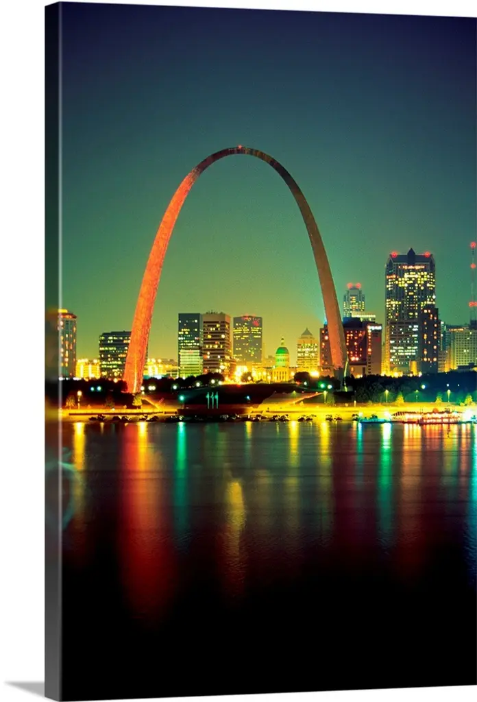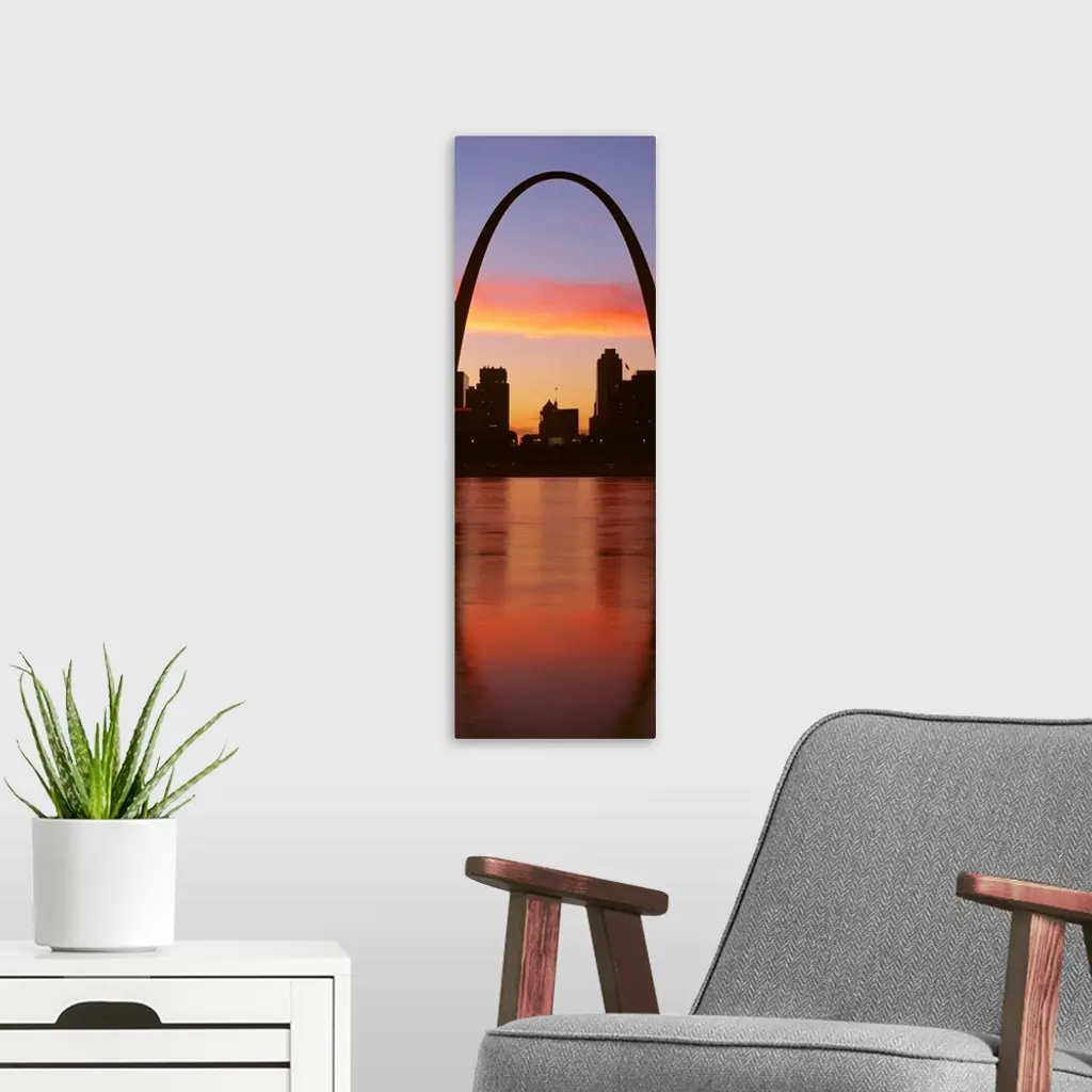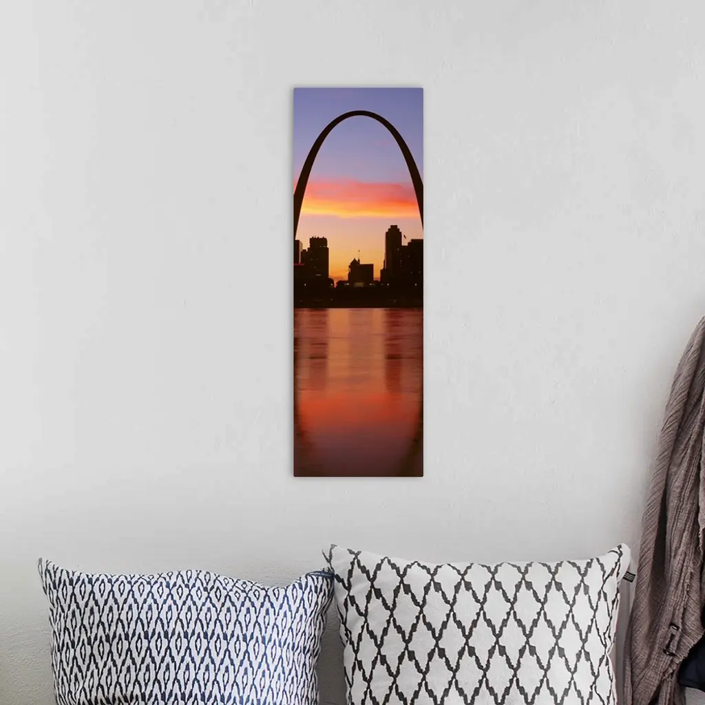 Vertical photograph on a big canvas of the Gateway Arch over St. Louis, Missouri, at sunrise.