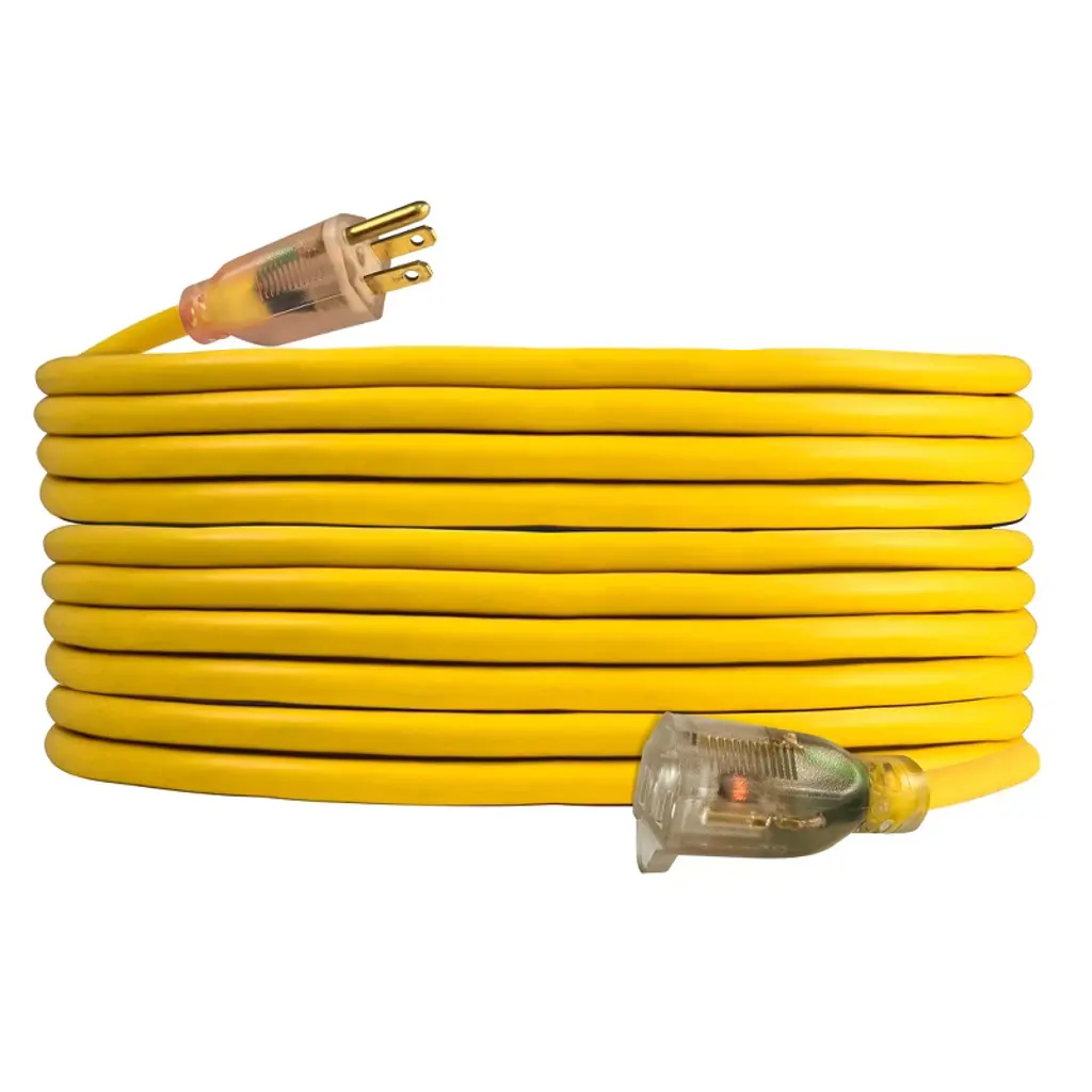 The US Wire and Cable 12/3 Gauge Lighted Extension Cords are a heavy-duty, 12/3 gauge SJTW cord designed for both indoor and outdoor use. Its power indicator light allows you to easily see when the cord is in use, providing added convenience and safety. The bright yellow color enhances visibility, reducing the risk of tripping hazards. Whether you're powering tools, outdoor equipment, or appliances, this kink-resistant and durable extension cord offers reliable performance and peace of mind. Order now for a high-quality and dependable extension cord for all your electrical needs!