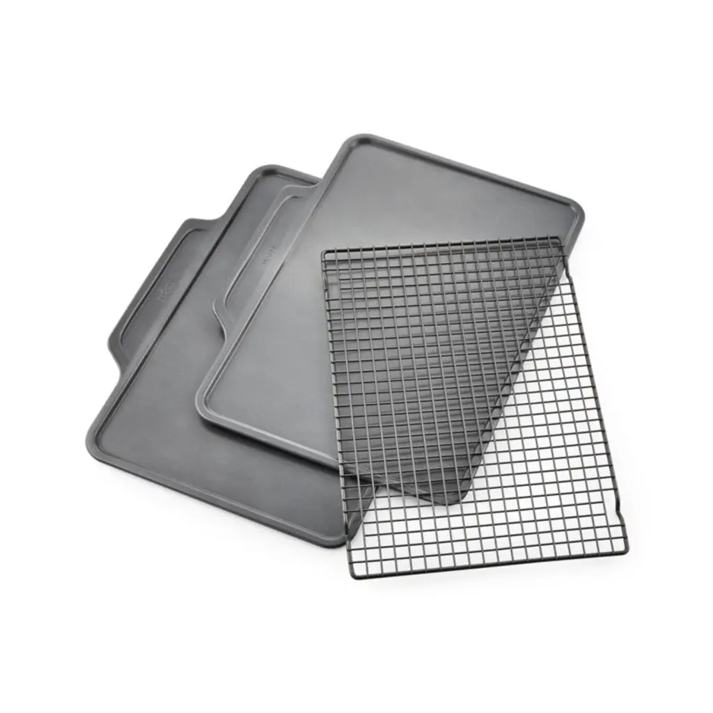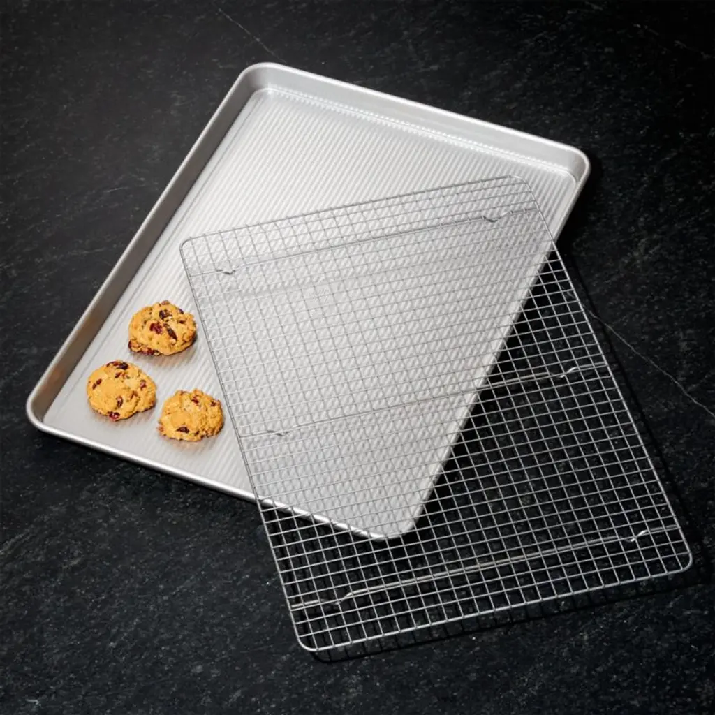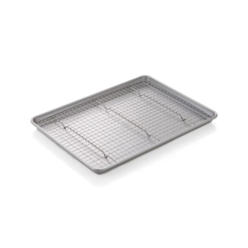 This commercial-quality cookie sheet has a silicone coating that's designed to release foods quickly and effortlessly. Half the size of traditional cookie sheets, the pan cooks up small batches of cookies or roasted vegetables, perfectly browned thanks to the pan's even heat distribution. Included cooling rack elevates cooked foods, allowing air to circulate beneath and stop the cooking process.