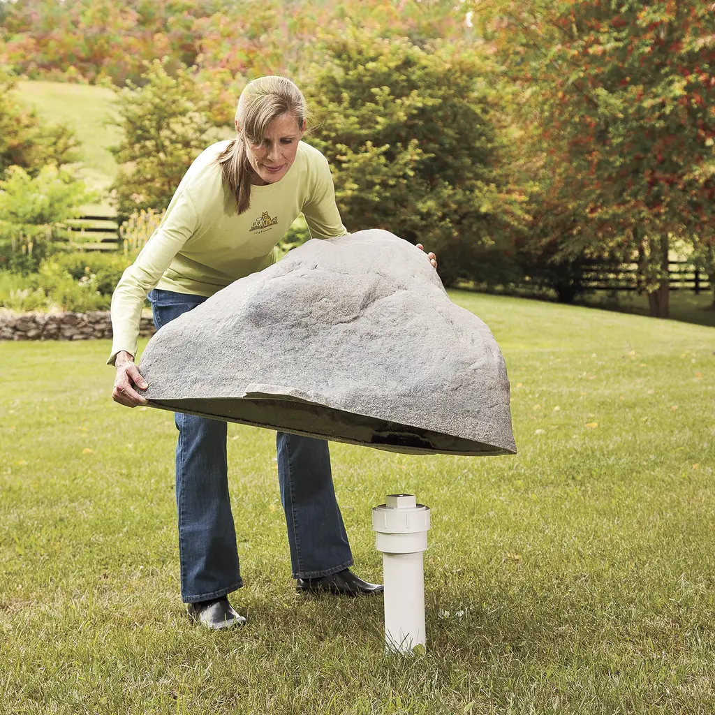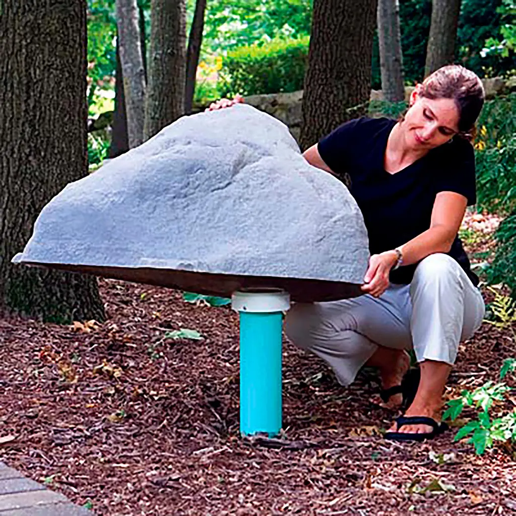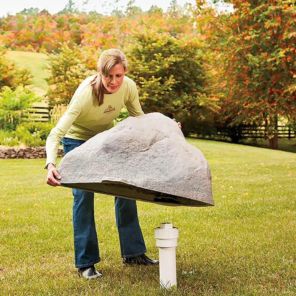Hide unsightly or dangerous problem areas in your yard or garden with our versatile, realistic Mock Rocks®. Lightweight but very durable, Mock Rocks have a hollow design that makes an attractive and economical solution to pipes, meters, bare spots, stumps and other landscaping problems. Our Medium Mock Rock is the perfect solution for pipes/meters up to 18"H, including: • Well/septic pipes • Centrifugal pumps • Small pump systems • Backflow assemblies The realistic design also makes Mock Rocks a great way to landscape and add texture, height and visual contrast to beds, borders, gardens and more. Mock Rocks are quality made in the USA from a recycled polyethylene blend that is both impact and weather resistant for years of use and beauty. Ground stakes for quick and easy securing are included. Mock Rocks come in two natural shades: gray and brown. Other sizes and shapes available. Not intended for septic vents, satellite dishes or gas lines.