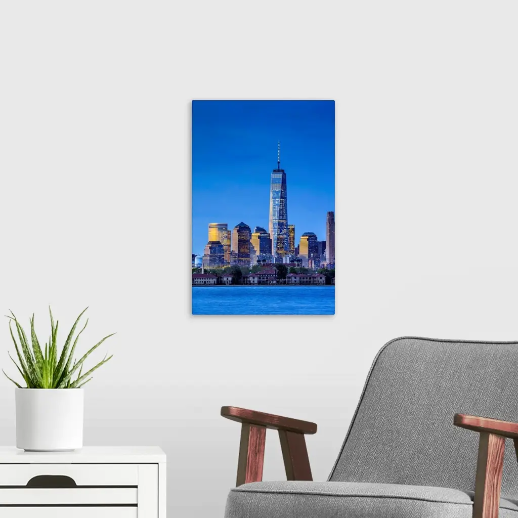 USA, New York City, Manhattan, Lower Manhattan, One World Trade Center, Freedom Tower, The Ellis Island, view from New Jersey towards Lower Manhattan, with the One World Trade Center, with Freedom Tower, at night.