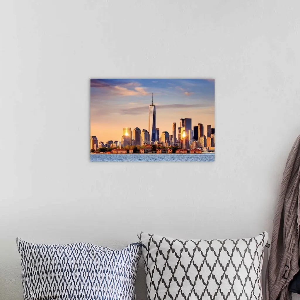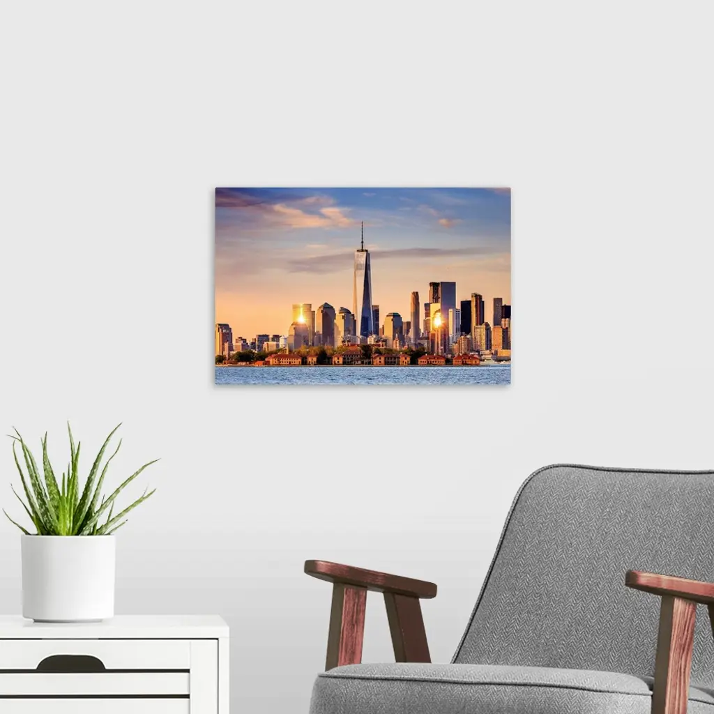 USA, New York City, Manhattan, Lower Manhattan, One World Trade Center, Freedom Tower, The Ellis Island, view from New Jersey towards Lower Manhattan, with the One World Trade Center, with Freedom Tower, at sunrise.
