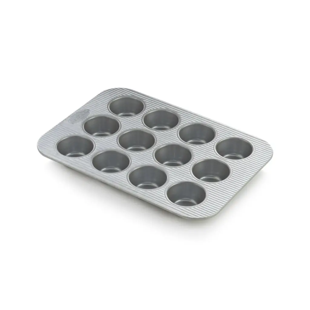 Our exclusive commercial-quality bakeware features a unique textured surface that promotes ideal air circulation and a double-duty nonstick Americoat and silicone glaze finish for clean food release. Durable folded construction with heavy-gauge wire is warp-resistant and rust-proof. Twelve cups cook up muffins, cupcakes, egg bakes and more. Due to this bakeware's heat efficiency, we suggest monitoring the oven temperature and cooking time for the first few uses, then making adjustments to recipes as necessary.