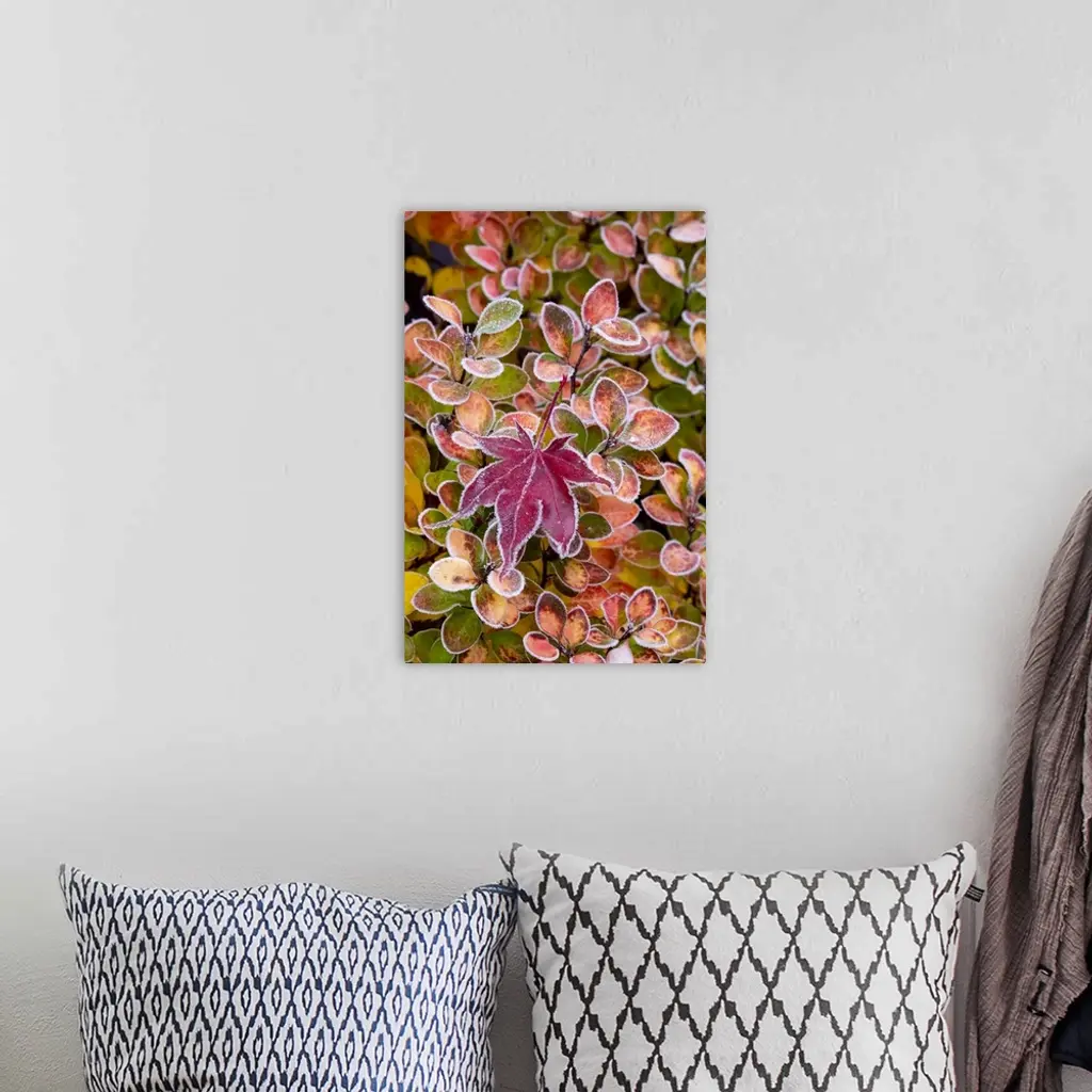 USA, Washington State, Sammamish. Autumn colors on frosted barberry and fallen Japanese maple Leaf.